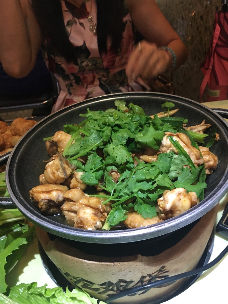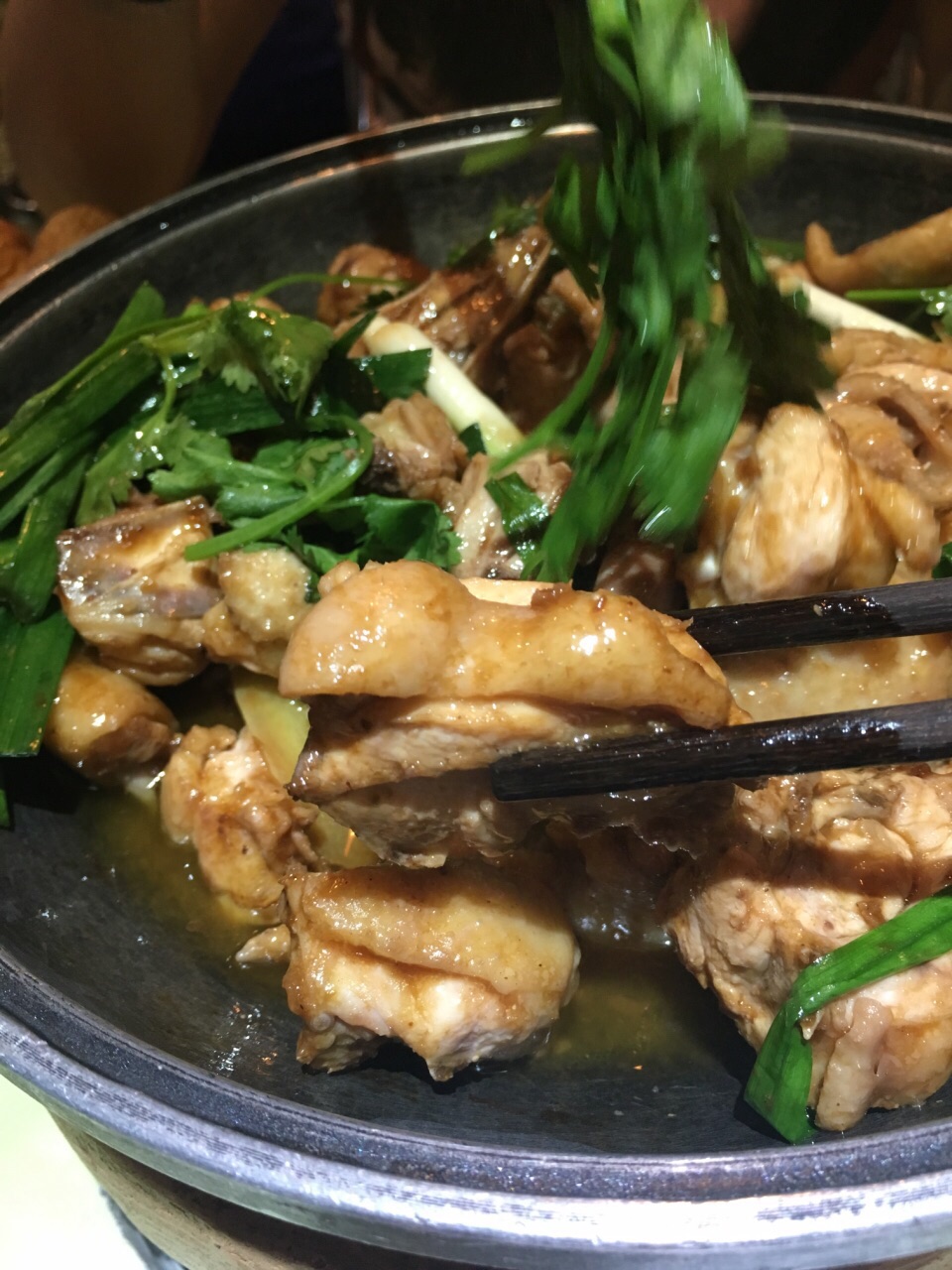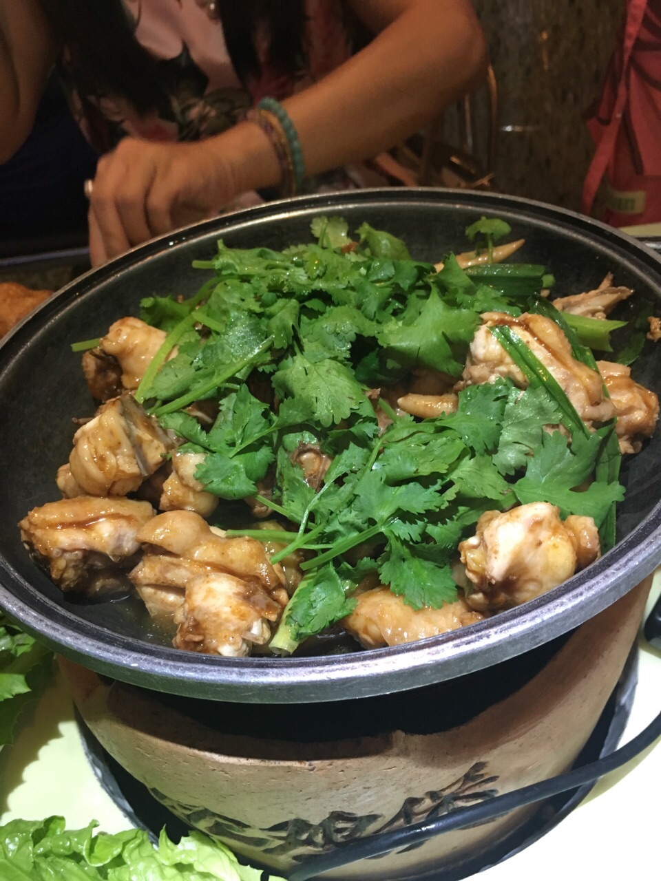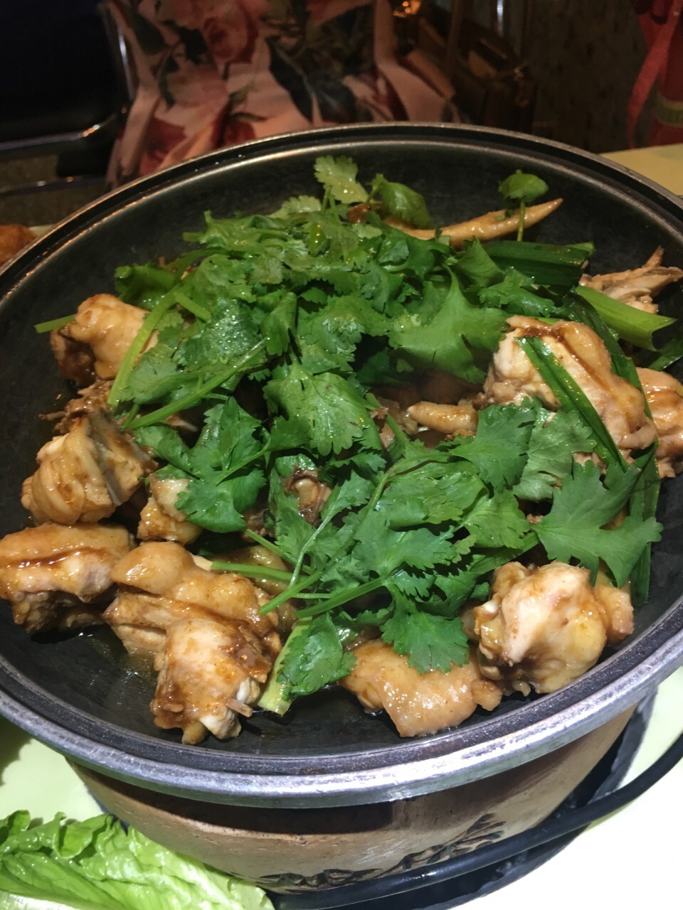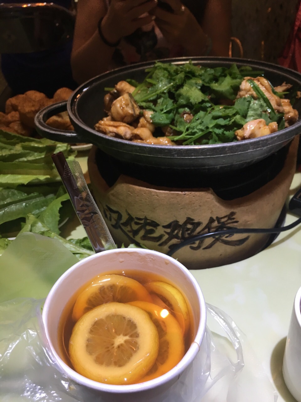 叹佬,整天经过第一次陪朋友来吃,位置坐得不舒服,灯光也处理得不太好,胜在服务员还是满诚恳的,所以也没换位置继续吃了。点了基础的鸡煲,以及青菜、面筋一份。鸡肉是想像中的弹牙爽口,肉质真的很鲜美,与一般在市场自已买的很不同。配上酱汁觉得来一碗白米饭真的不为过,两个吃一份刚刚好,另外点的面筋吃到最后是吸酱汁的,越滚越咸。味道满足,价格比外围农家菜的贵二三十块钱,整体贵上五六十块钱的。会再来