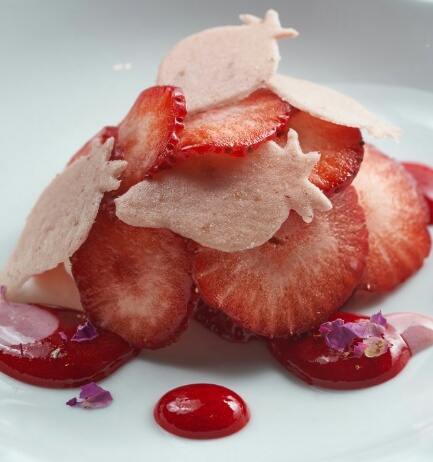 新鲜的草莓配上杏仁味冰淇淋及酥糖,再加上渍樱花,外面的糖脆吃的时候敲碎了混合在冰淇淋中,整个甜...