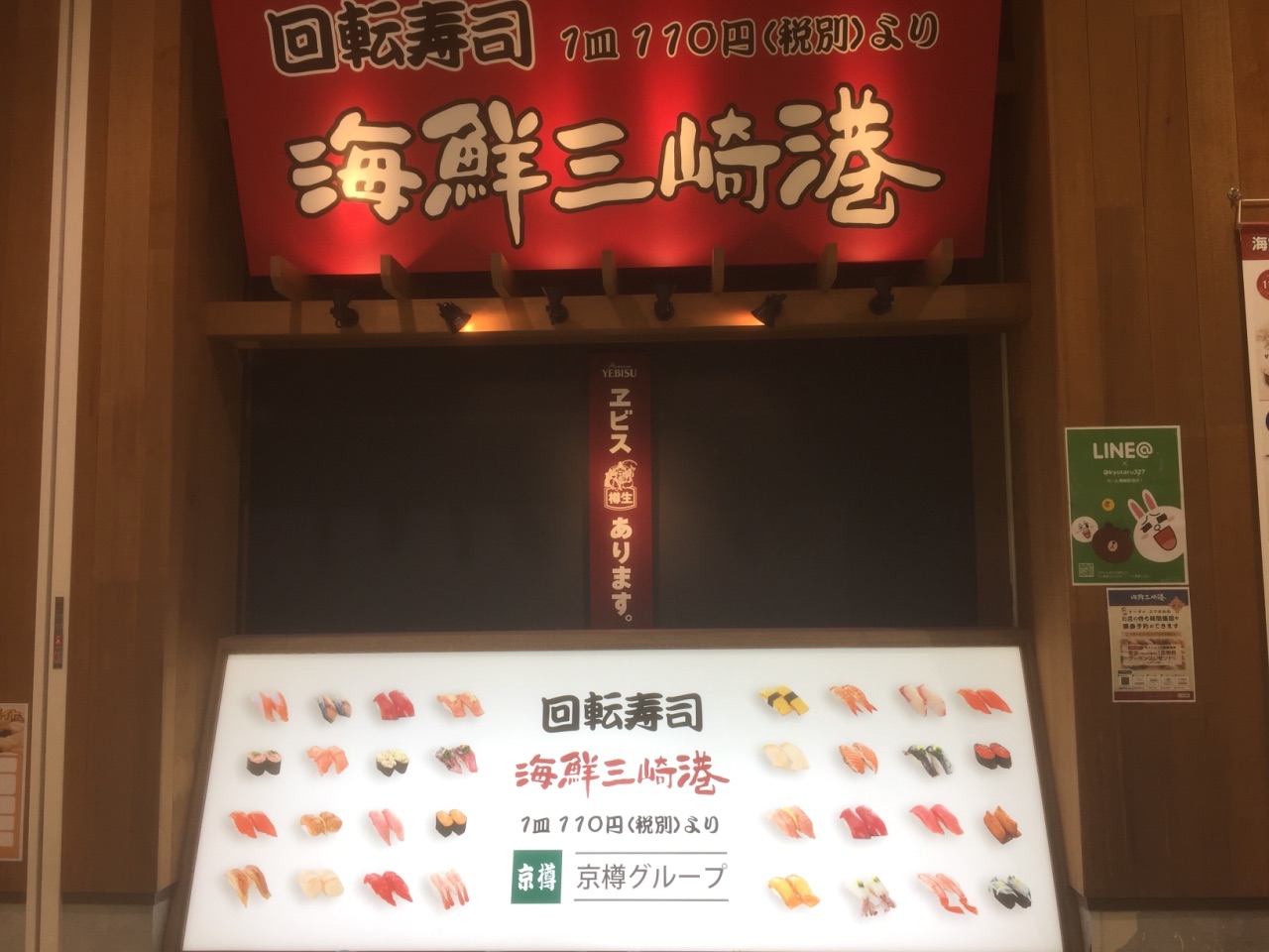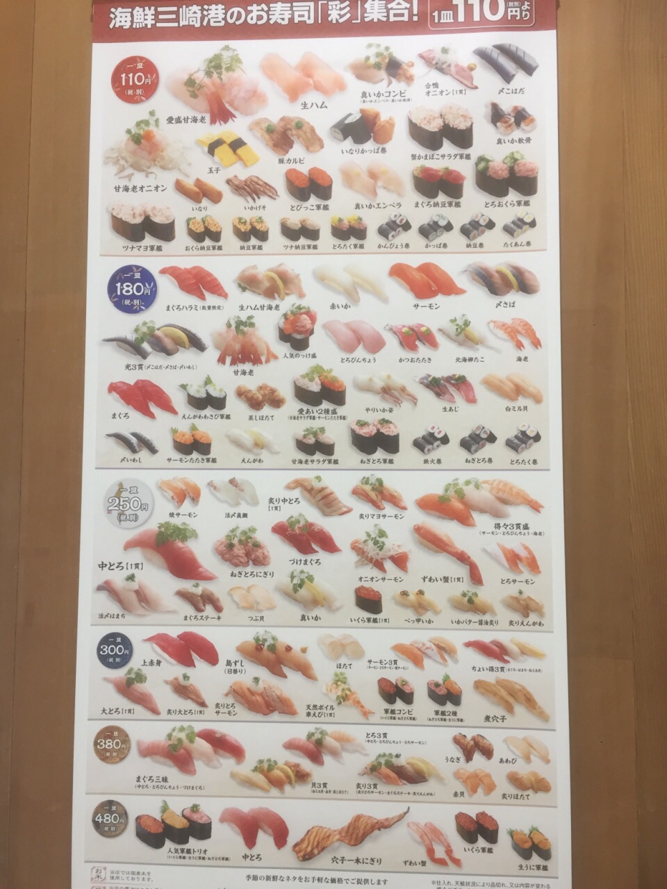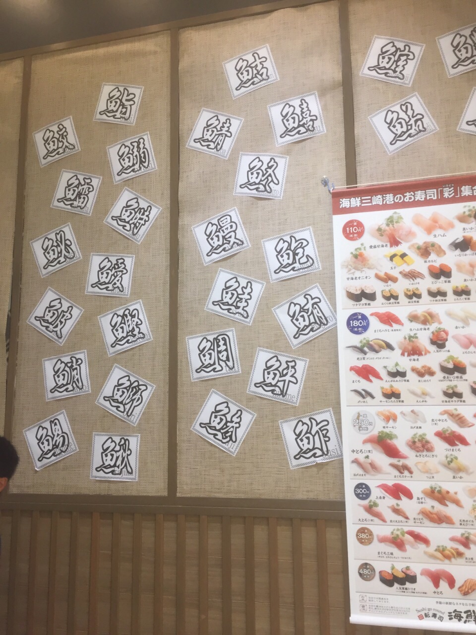 种类很多,非常过瘾的接地气名店。大多数寿司一盘两个110日元,也有部分上等海鲜寿司498日元一盘日本东京都江东区著名的砂町银座商店街附近的大型购物中心内餐饮街上的回转式寿司店:海鲜三崎港。大多数寿司一盘两个110日元,也有部分上等海鲜寿司498日元一盘;种类很多,非常过瘾的接地气名店