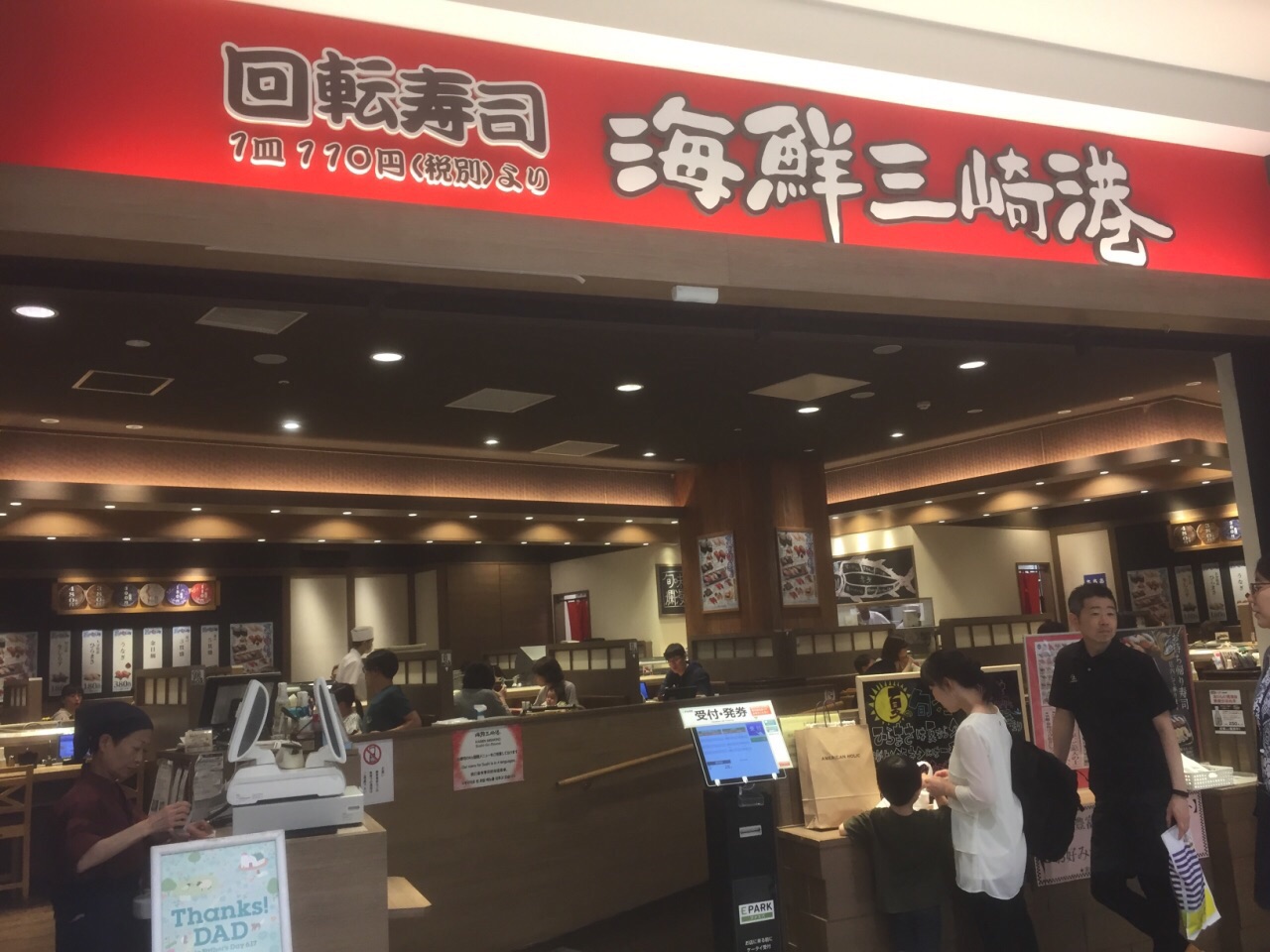 网友2018-06-05种类很多,非常过瘾的接地气名店。大多数寿司一盘两个110日元,也有部分上等海鲜寿司498日元一盘日本东京都江东区著名的砂町银座商店街附近的大型购物中心内餐饮街上的回转式寿司店:海鲜三崎港。大多数寿司一盘两个110日元,也有部分上等海鲜寿司498日元一盘;种类很多,非常过瘾的接地气名店
