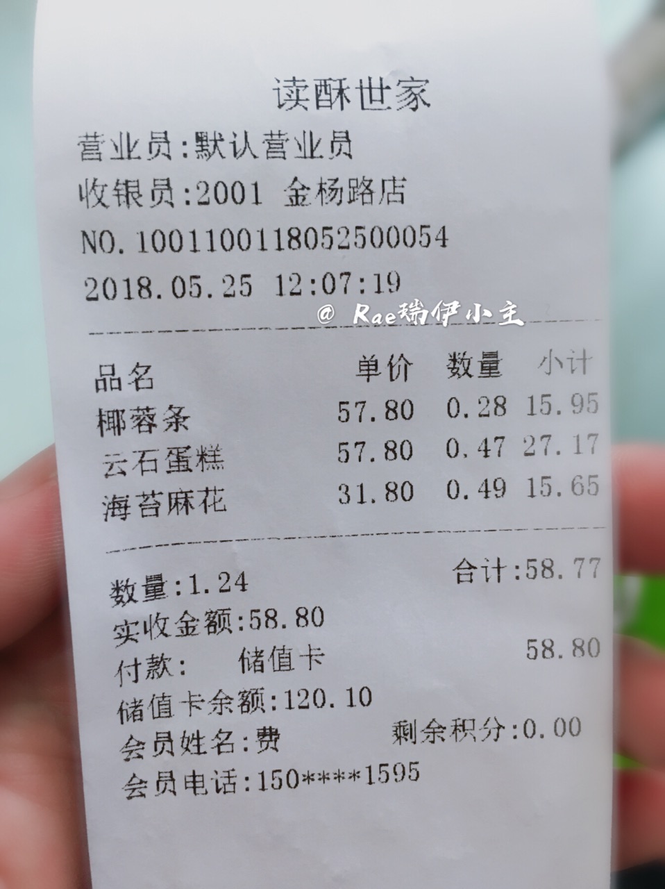 【吃货】180525【读酥世家(金杨路店)】他家的糕点品种好多~中式西式的都有,特别齐全,基本都能找到自己喜欢的口味 ★【海苔麻花】15.9元/斤,香香脆脆的 ★【云石蛋糕】28.9元/斤,口感糯香松软,好吃 ★【椰蓉条】28.9元/斤,有点像可颂面包,不过椰蓉味道不是很浓