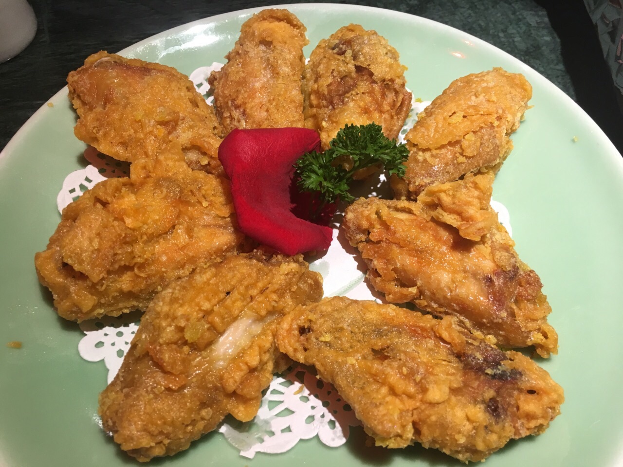 招牌的蛋黄鸡翅必点,香烤鲈鱼也不错,冰激凌烤布蕾,冰激凌还能再多点会更好吃