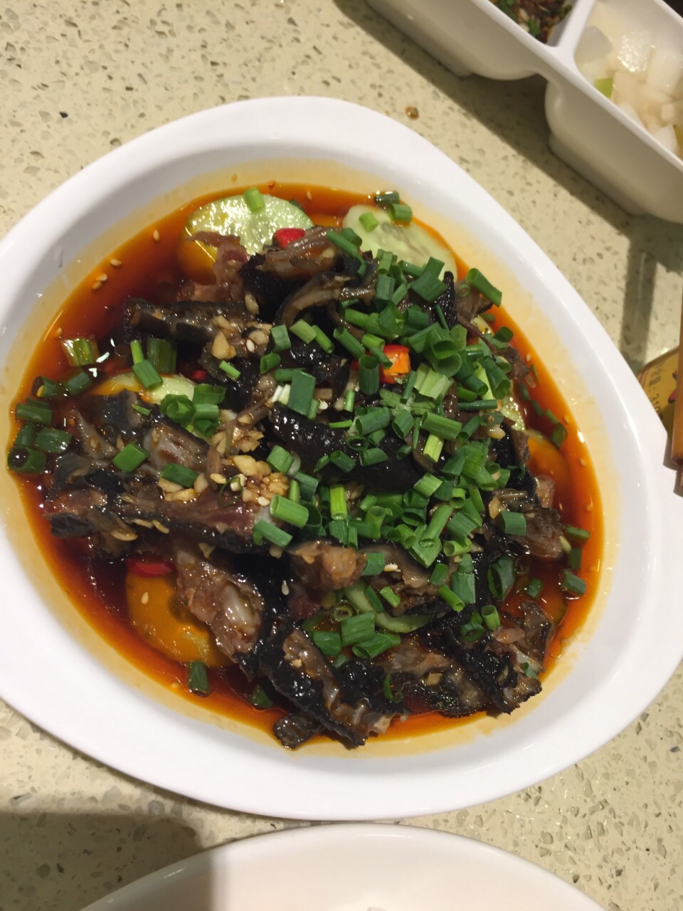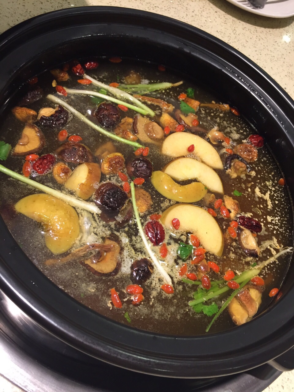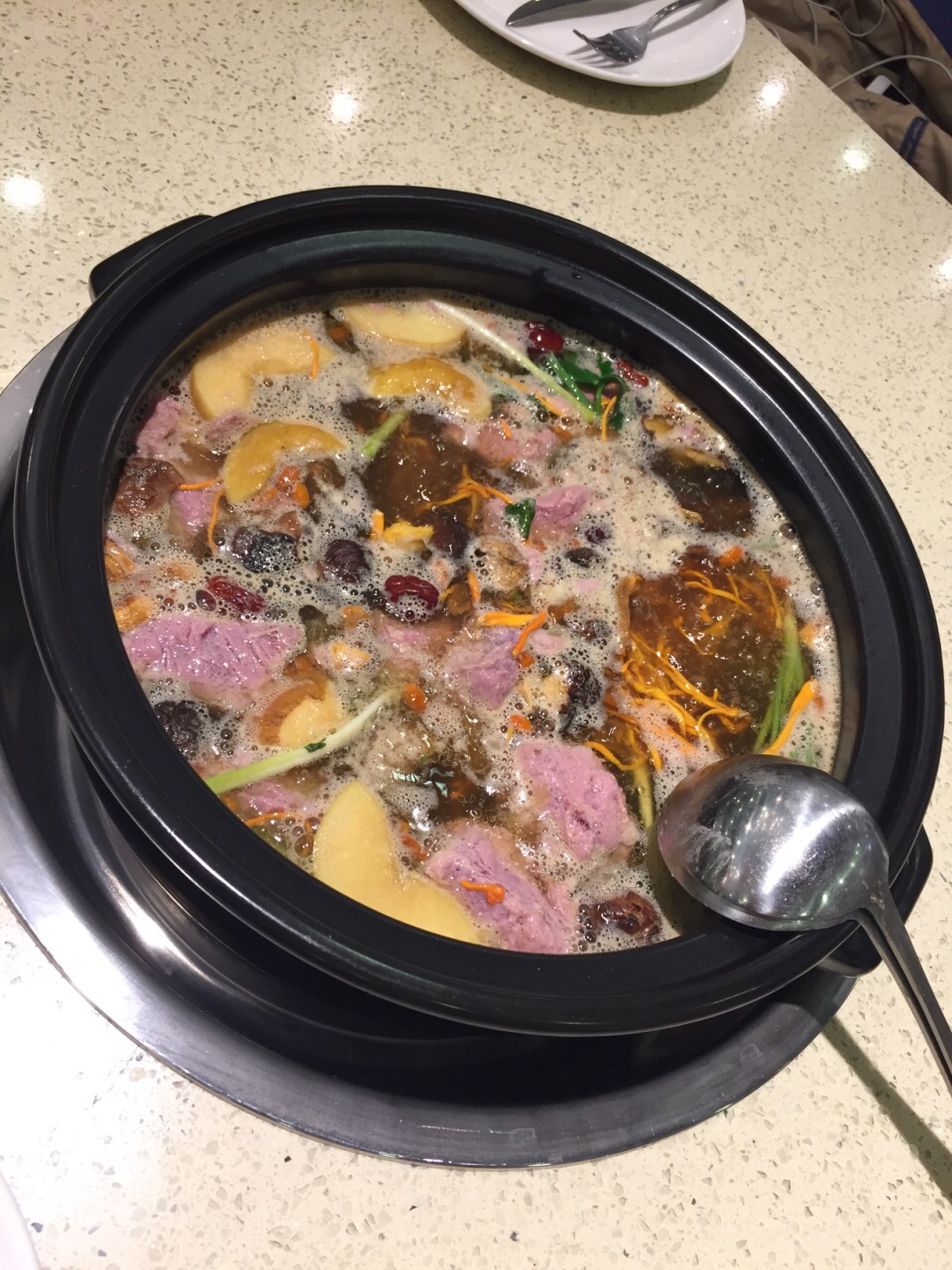 感觉不错的一家餐厅。晚上人不是很多,可以安静吃饭的那一种。服务员很热情也很实在,服务很周到。 非常推荐极品菌汤锅。一大锅非常实在的菌汤。各种菌菇在一般火锅店只给很少的量,他家给一大堆,吃不下都不好意思浪费。味道很鲜,锅底就可以当一道汤来喝。鲜黄牛肉就是比冻的强,放入锅中煮一会儿就好,不用炖,肉质就很嫩很有弹性,把鲜牛肉可以当主菜吃,吃饱。吃饱再喝汤,感觉很舒服。 蒜蓉黄瓜很清口,如果是吃辣的锅底,这个菜可以解辣。 三色牛蹄筋属于肉菜里面比较清爽不油腻的菜,有肉有菜,量也很多,一个人吃的话,配碗米饭也就饱了。 红糖锅盔非常喜欢,既是主食又可以当点心。甜糯米裹着红糖馅儿,外面油炸过,热的吃很香也不粘牙。凉了也可以当点心。 卤香牛尾一般,做得有点儿硬,不过用料倒是实在的。 整体装修、服务和菜品都不错,比较适合家常来吃。