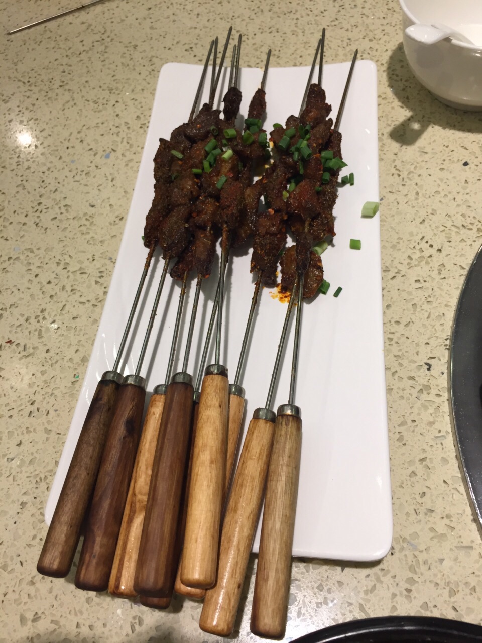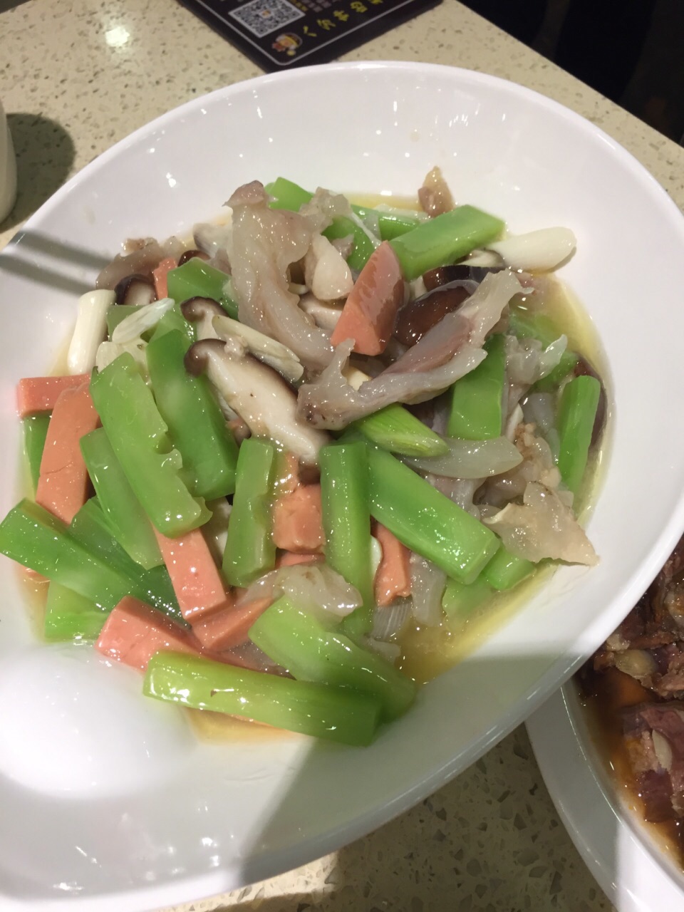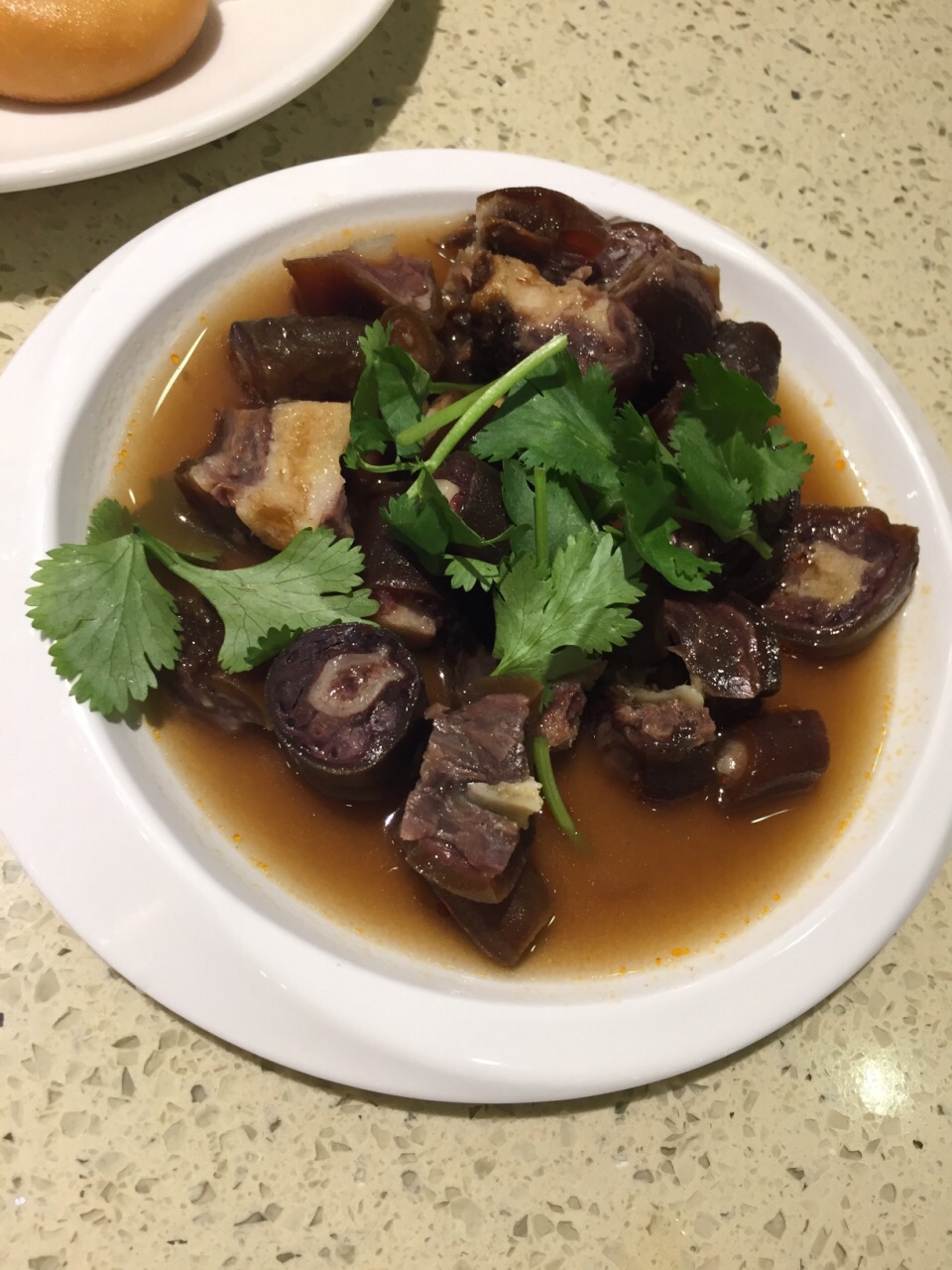 感觉不错的一家餐厅。晚上人不是很多,可以安静吃饭的那一种。服务员很热情也很实在,服务很周到。 非常推荐极品菌汤锅。一大锅非常实在的菌汤。各种菌菇在一般火锅店只给很少的量,他家给一大堆,吃不下都不好意思浪费。味道很鲜,锅底就可以当一道汤来喝。鲜黄牛肉就是比冻的强,放入锅中煮一会儿就好,不用炖,肉质就很嫩很有弹性,把鲜牛肉可以当主菜吃,吃饱。吃饱再喝汤,感觉很舒服。 蒜蓉黄瓜很清口,如果是吃辣的锅底,这个菜可以解辣。 三色牛蹄筋属于肉菜里面比较清爽不油腻的菜,有肉有菜,量也很多,一个人吃的话,配碗米饭也就饱了。 红糖锅盔非常喜欢,既是主食又可以当点心。甜糯米裹着红糖馅儿,外面油炸过,热的吃很香也不粘牙。凉了也可以当点心。 卤香牛尾一般,做得有点儿硬,不过用料倒是实在的。 整体装修、服务和菜品都不错,比较适合家常来吃。