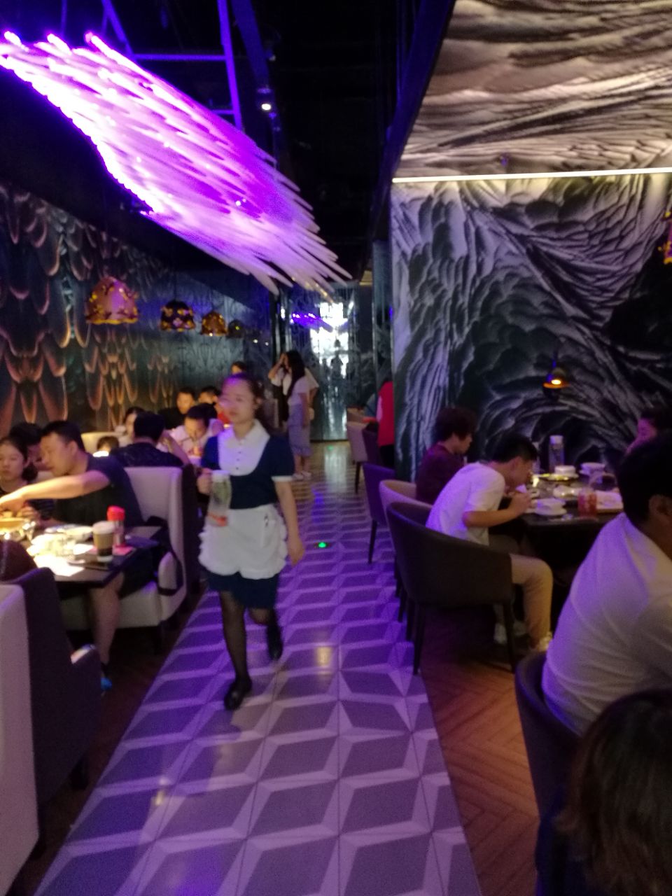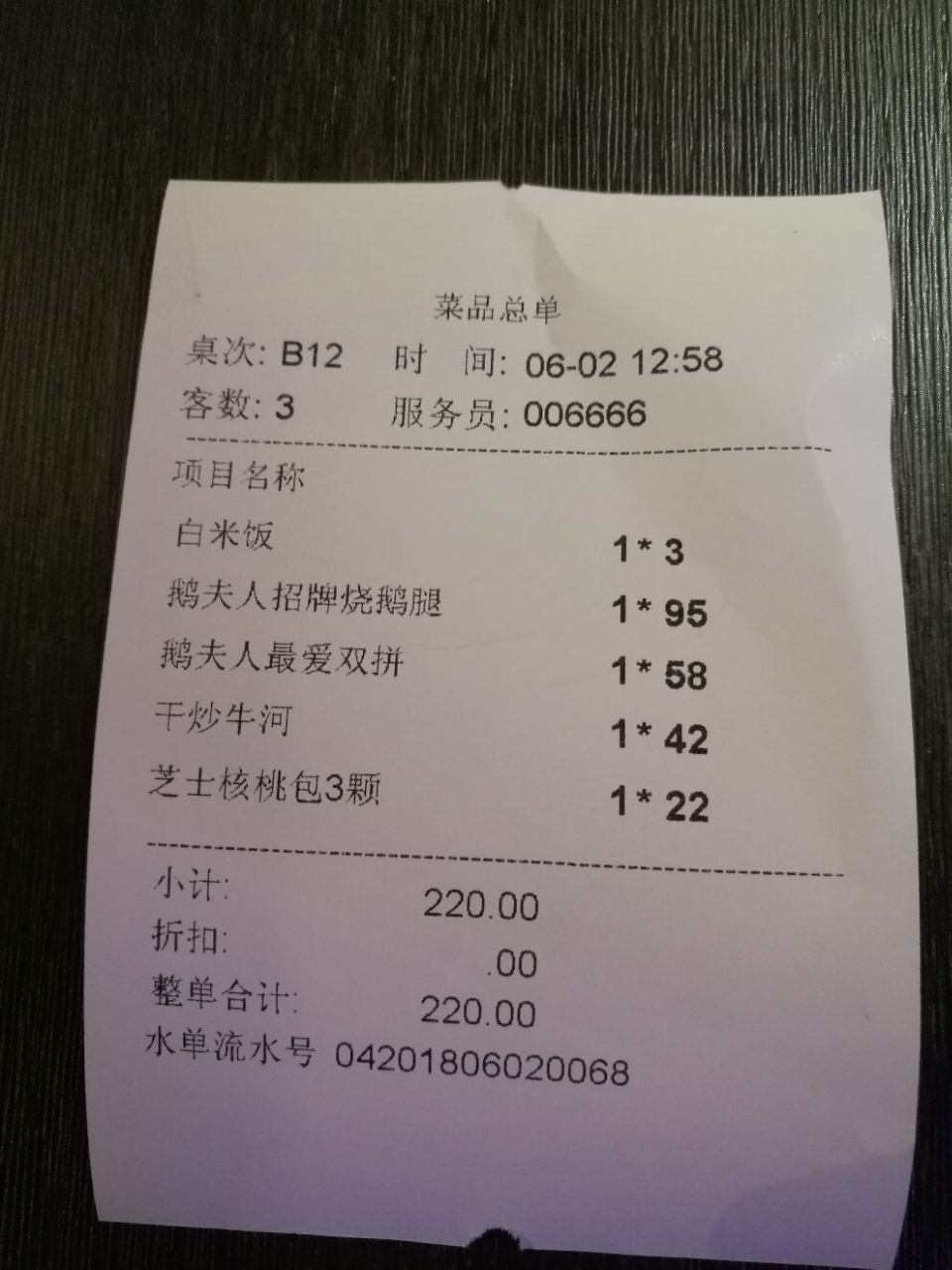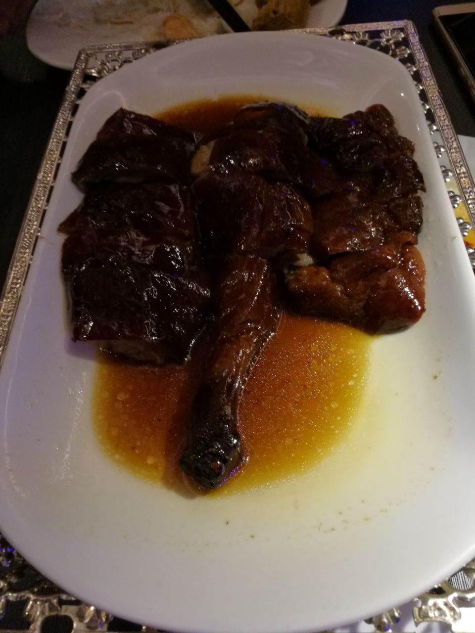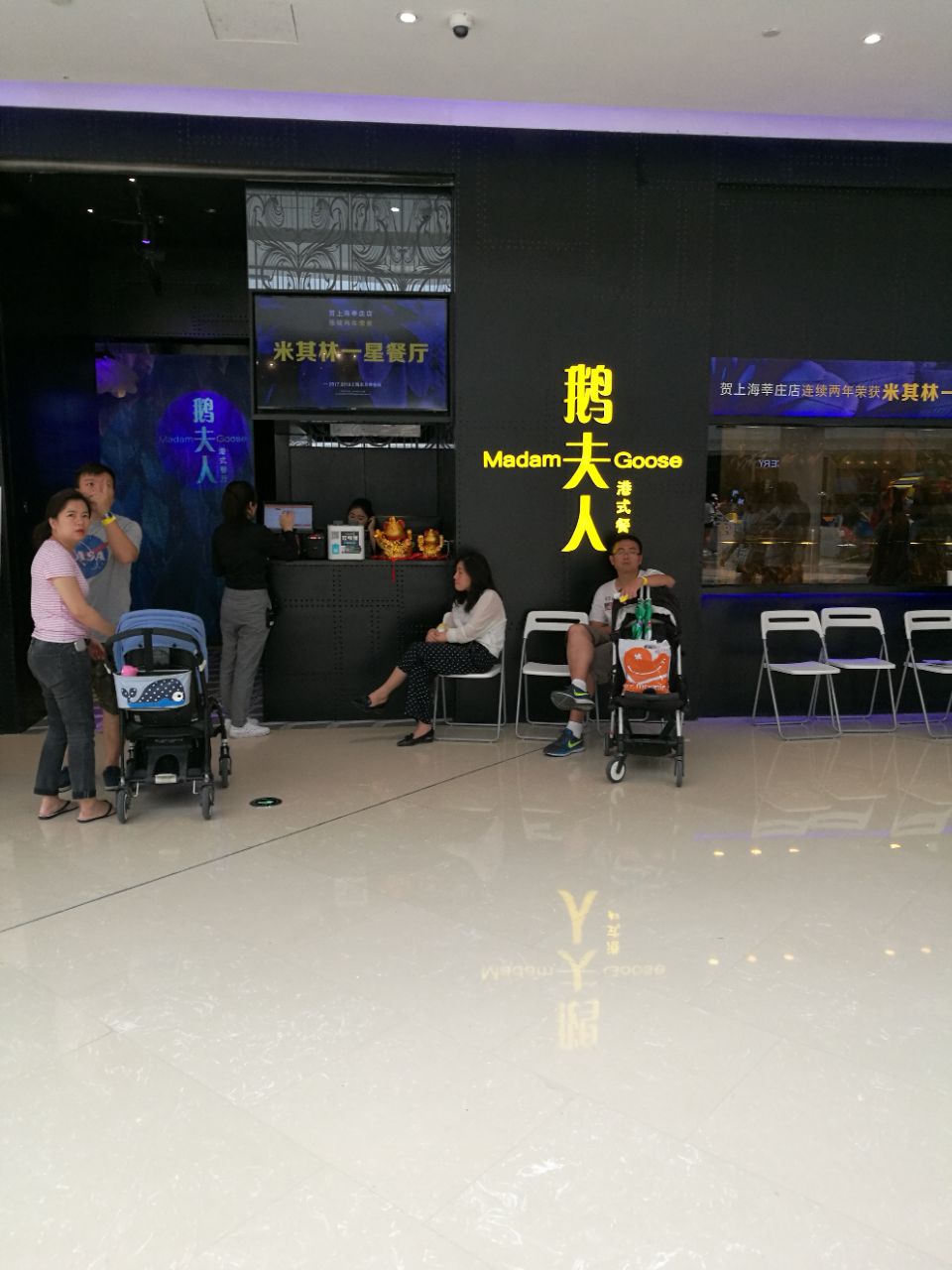 其他餐厅差不多。进去以后也没觉得有什么,环境上没有给我惊艳的感觉。鹅夫人的菜品不多,其实我觉得这样挺好,菜品不用那么多,品质好就行。 |干炒牛河^42,一直都记得徐克电影《满汉全席》里的火焰干炒牛河,所以看到菜单就想点。这是上菜最快的一道菜。上面的牛肉很嫩,但是缺点是稍微有点油。 |鹅夫人最爱双拼^58,这个双拼指的是玫瑰豉油鸡和蜜汁叉烧的组合。叉烧很甜,鸡肉很嫩,但是鸡皮非常腻。 |鹅夫人招牌烧鹅(含腿)^95,我看几乎每桌都点,心想这是招牌菜,应该是最好吃的,没想到大失所望。首当其冲的感觉就是腻,那叫一个油汪汪的。这一盘烧鹅两个人吃实在是消受不了,吃两块就腻得不行,最后强努着吃完了。 |芝士核桃包^22,很有新意的甜点,外边做得想核桃,里面也真的有核桃仁。 总结,可能是我们把最招牌的烧鹅放在最后吃的缘故,还是最先吃也会腻,反正让我给这道招牌菜很高的评价我是做不到。其他菜品还算中规中矩,但是我发现菜单上很多菜性价比真是不高。因为人多,服务也不是太跟得上。可能咱们寻常老百姓接受米其林这三个字真的是有难度。