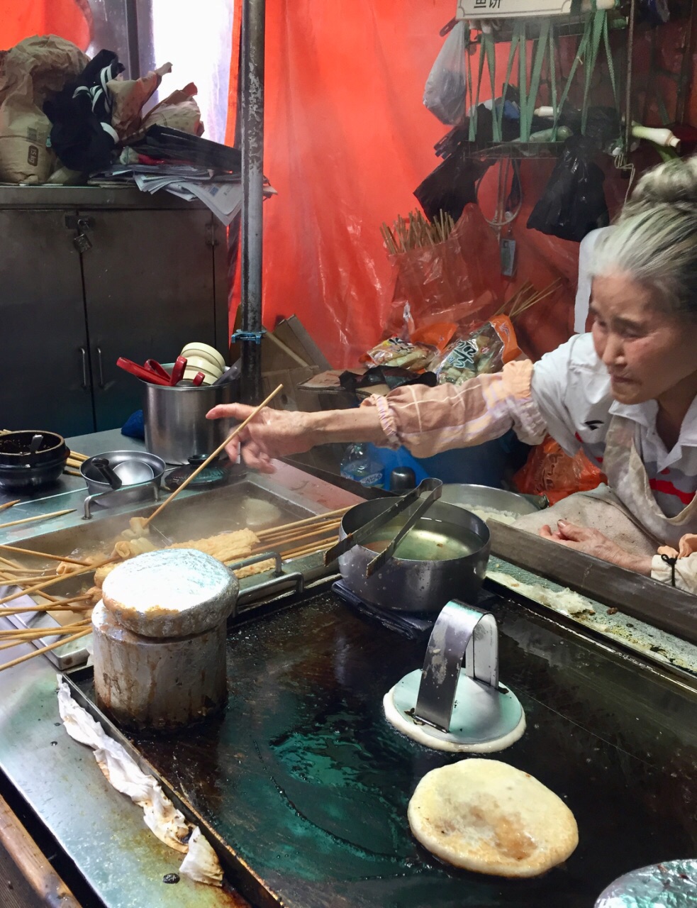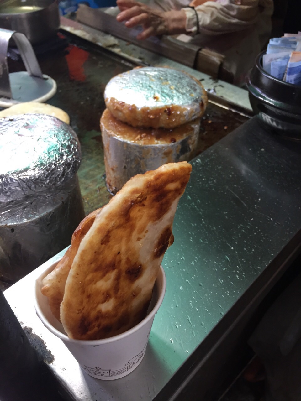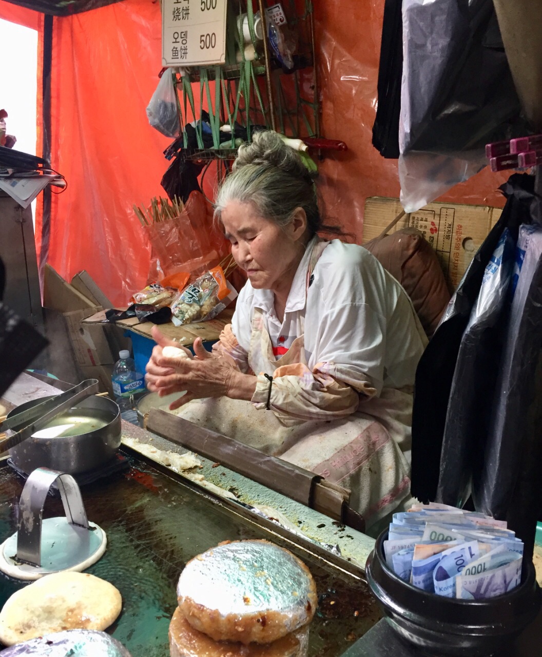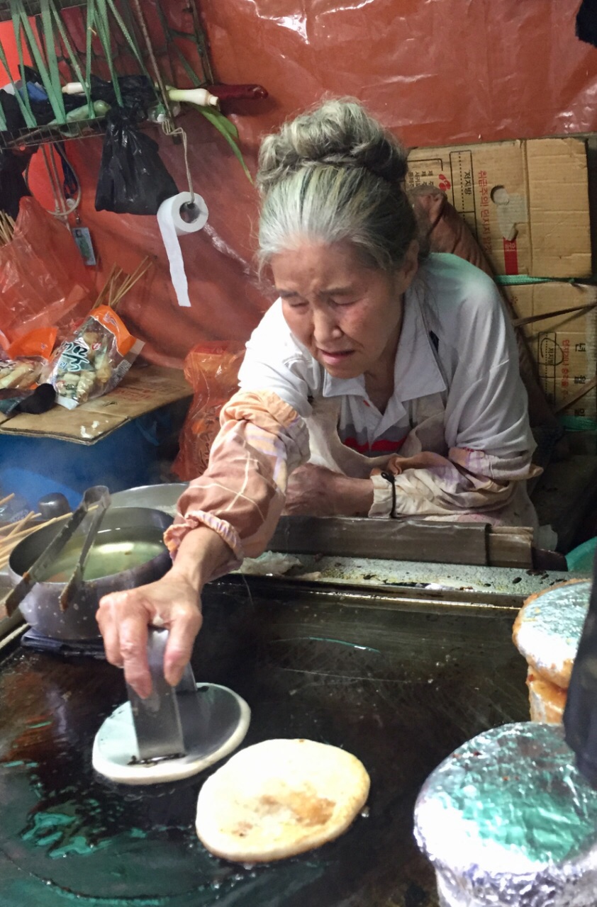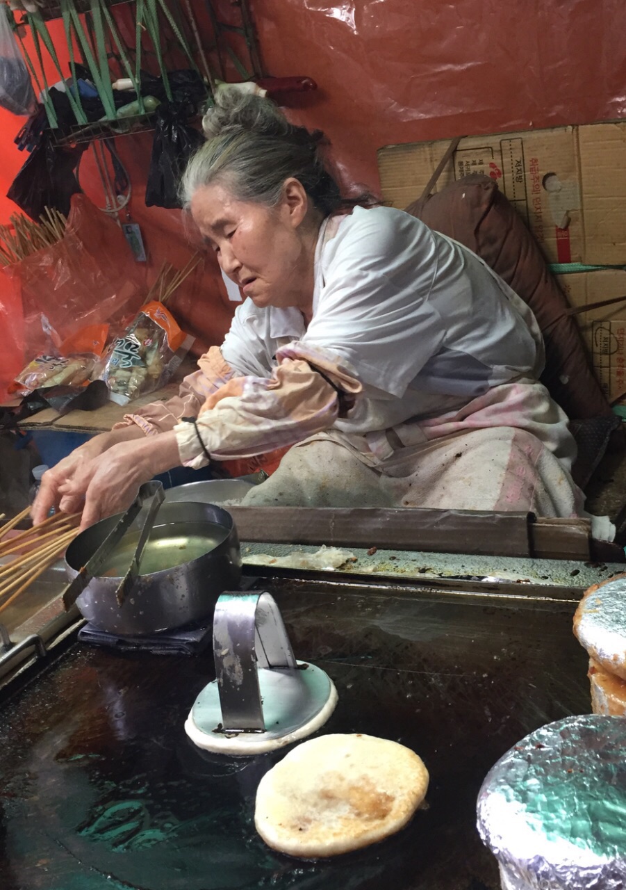 濟州東門市場門口 有位老奶奶煎餅 看見人龍 果斷排隊等吃 老奶奶手腳俐落 把花生糖粉包在麵糰中 壓扁後 油煎兩面 兩分鐘左右 熱呼呼的煎餅就完成了 一個500韓元=15元台幣 人潮自動把錢放入小碗中 老奶奶把煎好的煎餅折半 放入小紙杯裏 銀貨兩訖 陰雨多風的天氣 甜甜熱熱的老奶奶煎餅 真是濟州最溫暖的美食~