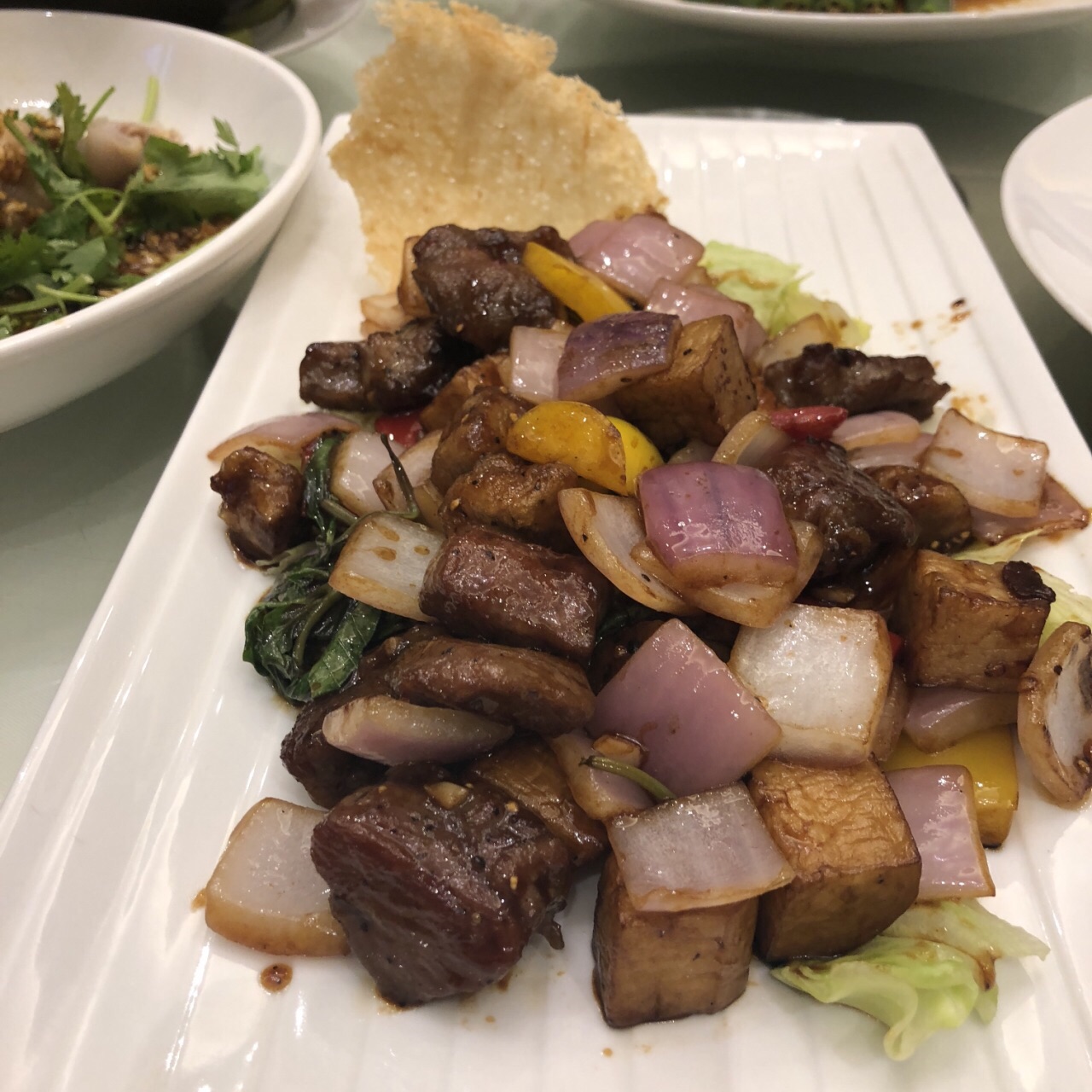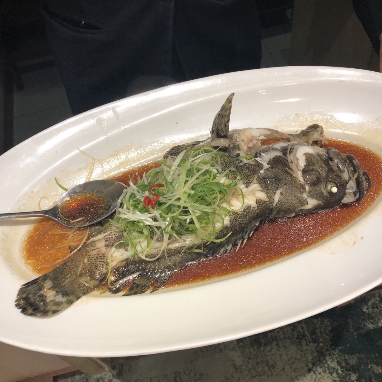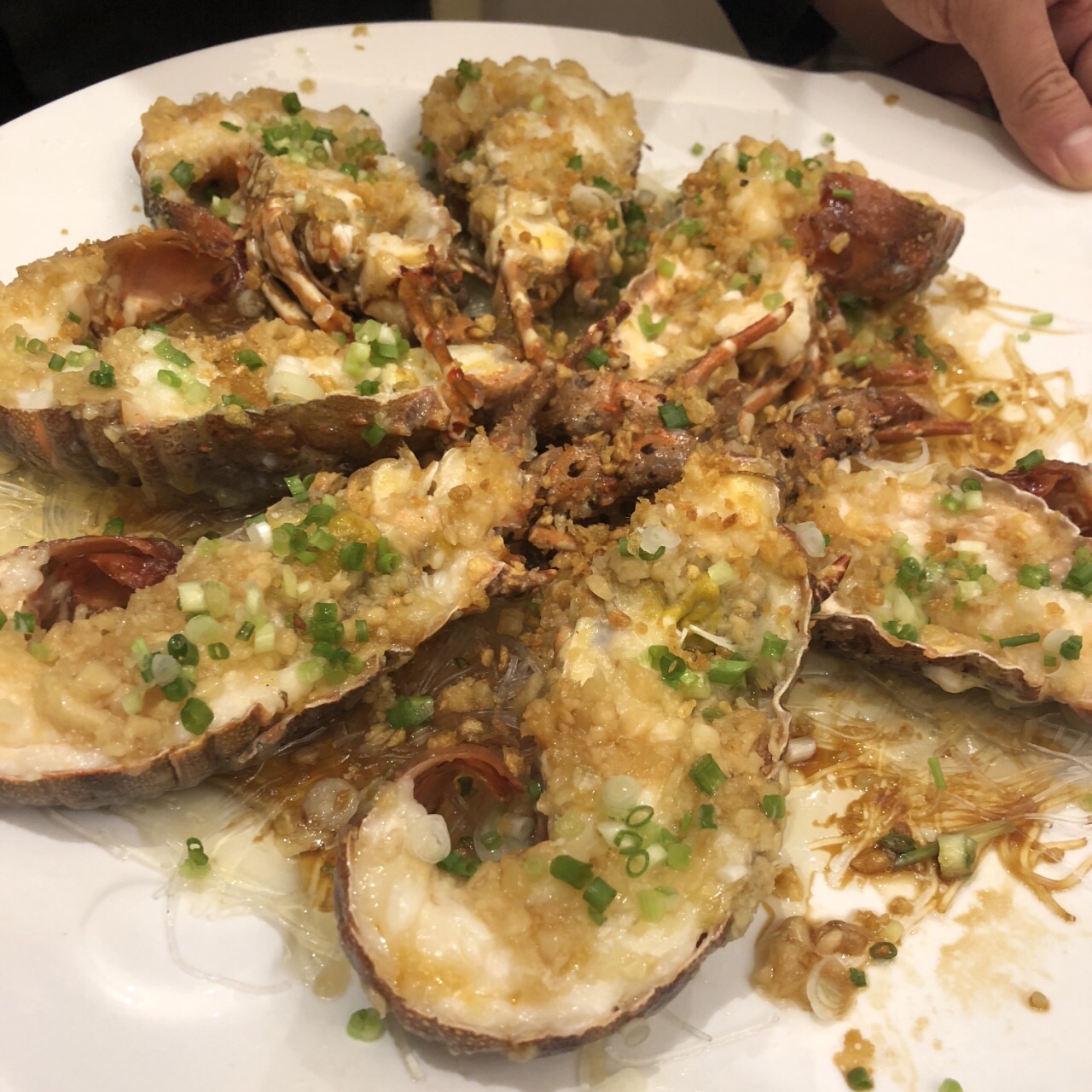 清蒸大龙趸,第一次听说这个鱼名诶,反正也是很高级,很鲜很嫩,的确是很适合清蒸的做法! 法式鹅肝牛柳粒,也是加了鹅肝就贵了的一道长辈菜,哈哈哈!鹅肝很嫩,入口即化。牛肉也很不错 蒜蓉开边整龙虾,一人半个小青龙也是相当过瘾了!