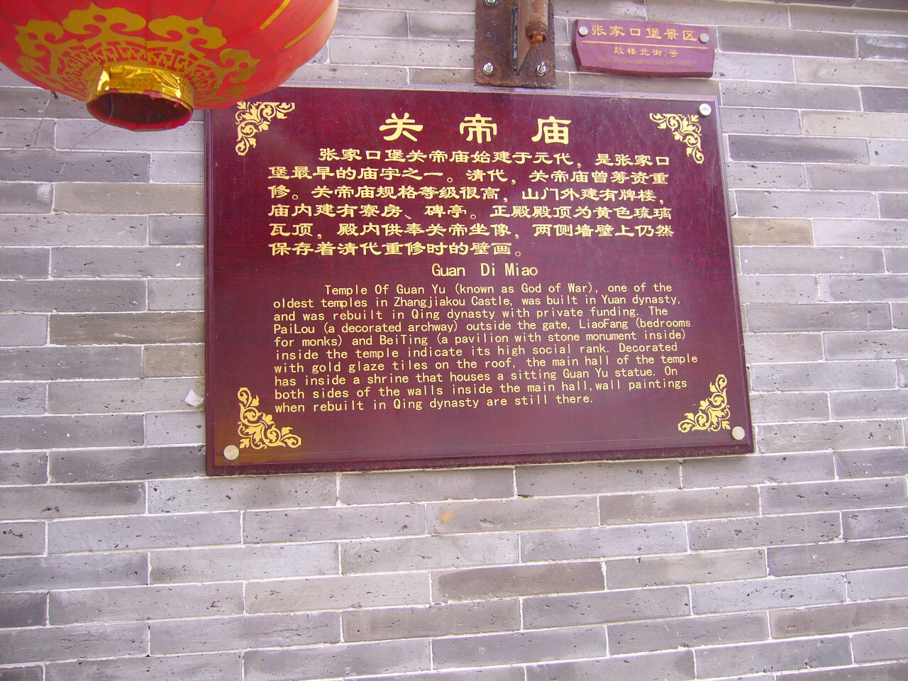 庙宇外观看起来很有气势,是堡子里景区不错的一个景点。关帝庙是张家口堡最古老的庙宇之一张家堡景区内的关帝庙据介绍始建于元代,在清朝时成为护佑张库大道商人的寺庙,香火鼎盛。关帝庙是张家口堡最古老的庙宇之一。庙宇外观看起来很有气势,是堡子里景区不错的一个景点。