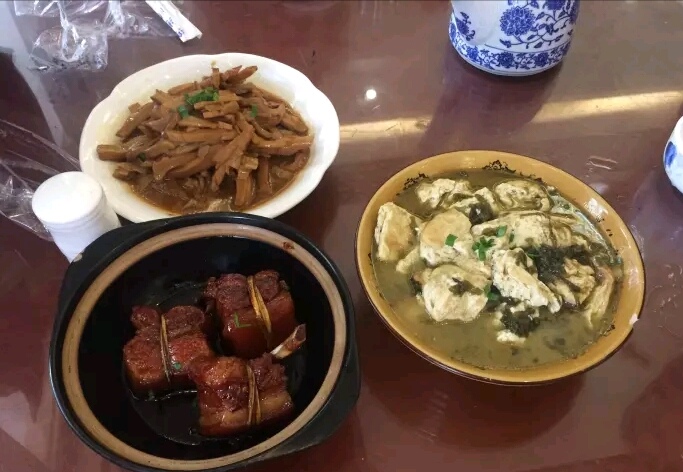 点了店里面的特色菜,雪菜豆腐,稻柴五花块肉,红烧笋干,跟平时家里做的味道就是不一样,有农家柴火灶的韵味。干蒸土鸡没有点,下次再来吃,居说也不错。清炒马兰头,份量足,挺新鲜。红烧鳊鱼,活杀现烹,味道上乘。主食是菜肉馄饨,家里做的味道。