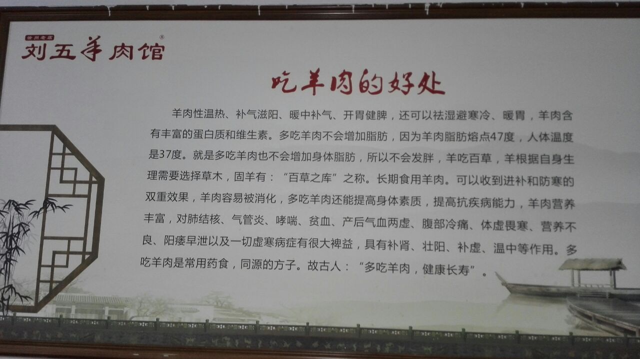 网友2018-06-16刘五羊肉味道很好,份量不小,就餐环境和卫生条件一般刘五羊肉味道很好,份量不小,就餐环境和卫生条件一般。北方人一般冬天吃羊肉,徐州人则讲究吃“伏羊”,即三伏天吃羊肉发散内热,可谓一养生之道。