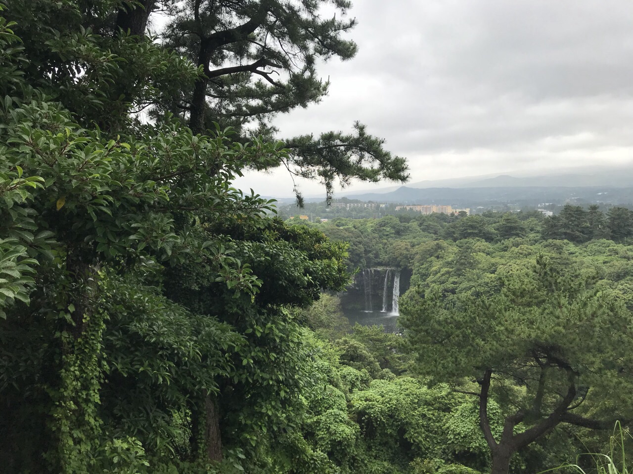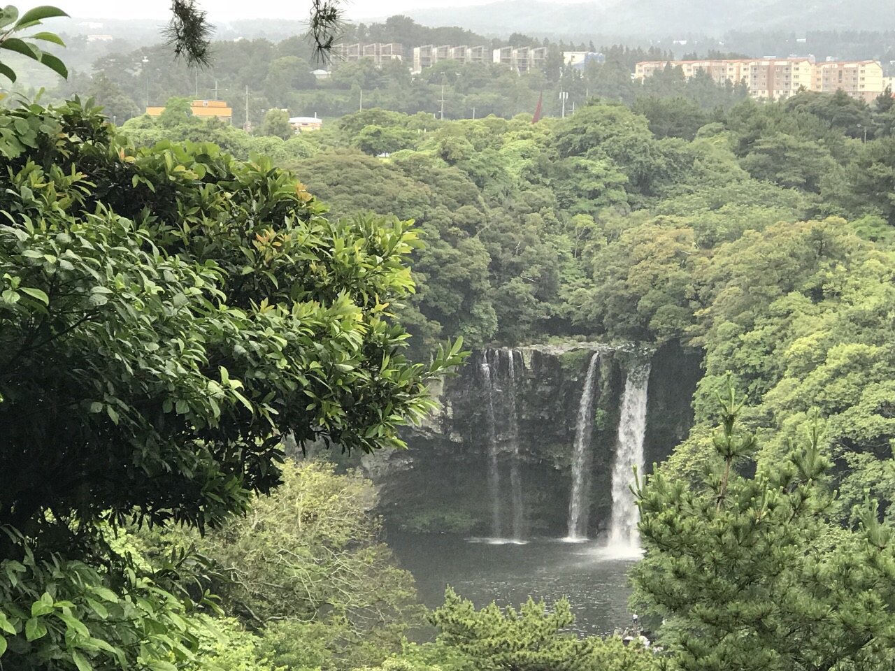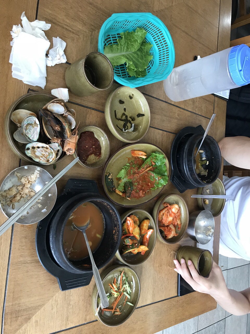 住附近的话,强烈建议去吃。价格实惠,环境干净,很多本地人去吃。我们两个人,点了一个海鲜锅,一个大酱汤(各送一份米饭),一共花了22000韩元,约130元人民币,是我在济州岛吃的最便宜的一餐。送的小菜很多,且大份,可以免费续,同时还送一盘辣炒五花肉,感觉五花肉单点都得几十块钱了呢,都很好吃哦。我的海鲜锅里面,有5只鲍鱼(超级嫩),一只虾,好多青贝,还有一只海胆。另外大酱汤里是五花肉,豆腐和一些配菜。味道都挺好的,特别推荐!后面两张图是附近的天地渊瀑布。