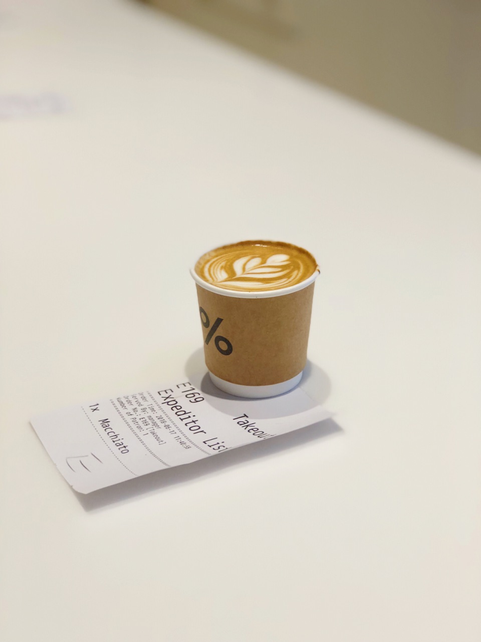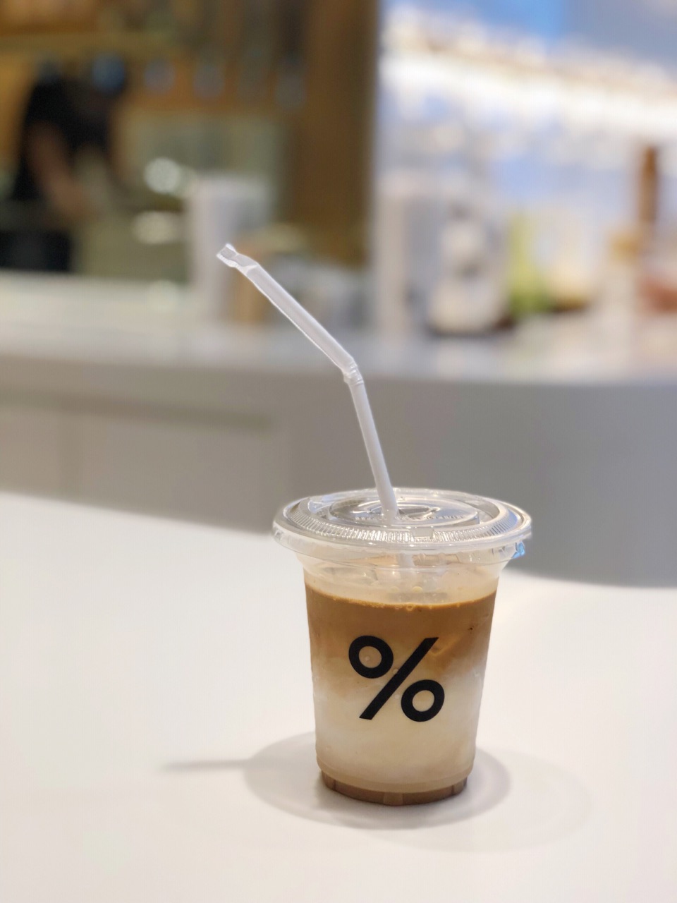 #2018.06 香港有个荷里活# 上海的[%]咖啡排队太厉害,香港偶遇且不要排队,当然要买一杯试试。 冰拿铁少冰,咖啡和牛奶有分层,咖啡烘培的香气在唇齿间流淌。小杯的浓缩咖啡也很受欢迎。 店里挑咖啡豆的小哥长得很清秀~