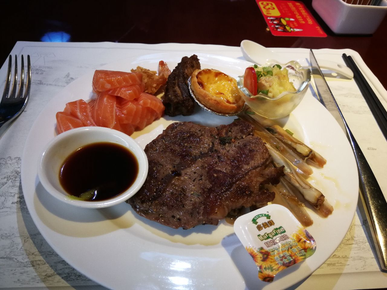 网上口碑不错哟,试着去吃吃,七点多能吃的已经不是太多了,用餐人也少了,三文鱼任吃,牛排也是现烤...