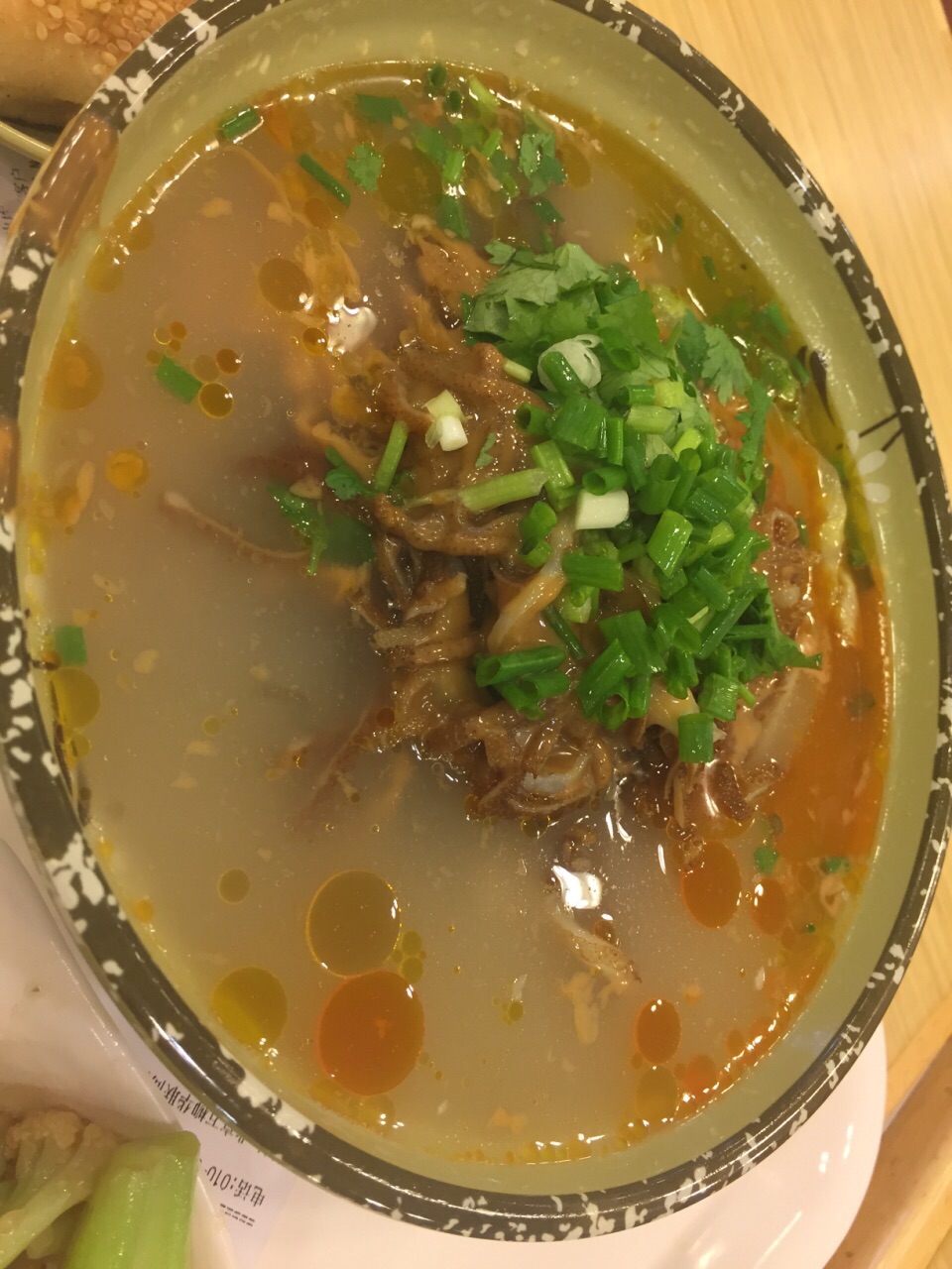 老北京的爆肚,居然可以这样吃!好大好大的一碗,汤汁浓郁,碗里面肚丝,有豆腐丝,有水晶粉丝,有香菜等各种调料汁,当然水晶粉丝最多,肚丝最少哈,还配有一个芝麻火烧。吃起来,真的很香,粉丝变得也很好吃了,汤很有味,浓浓的,好喝!