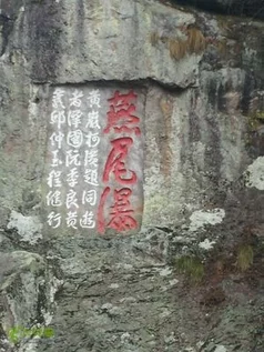 《劈叉倾泻燕尾瀑》溪触龙门分两岔,劈叉倾泻燕尾瀑。瀑下碧潭映彩霞,东西龙潭五彩瀑。