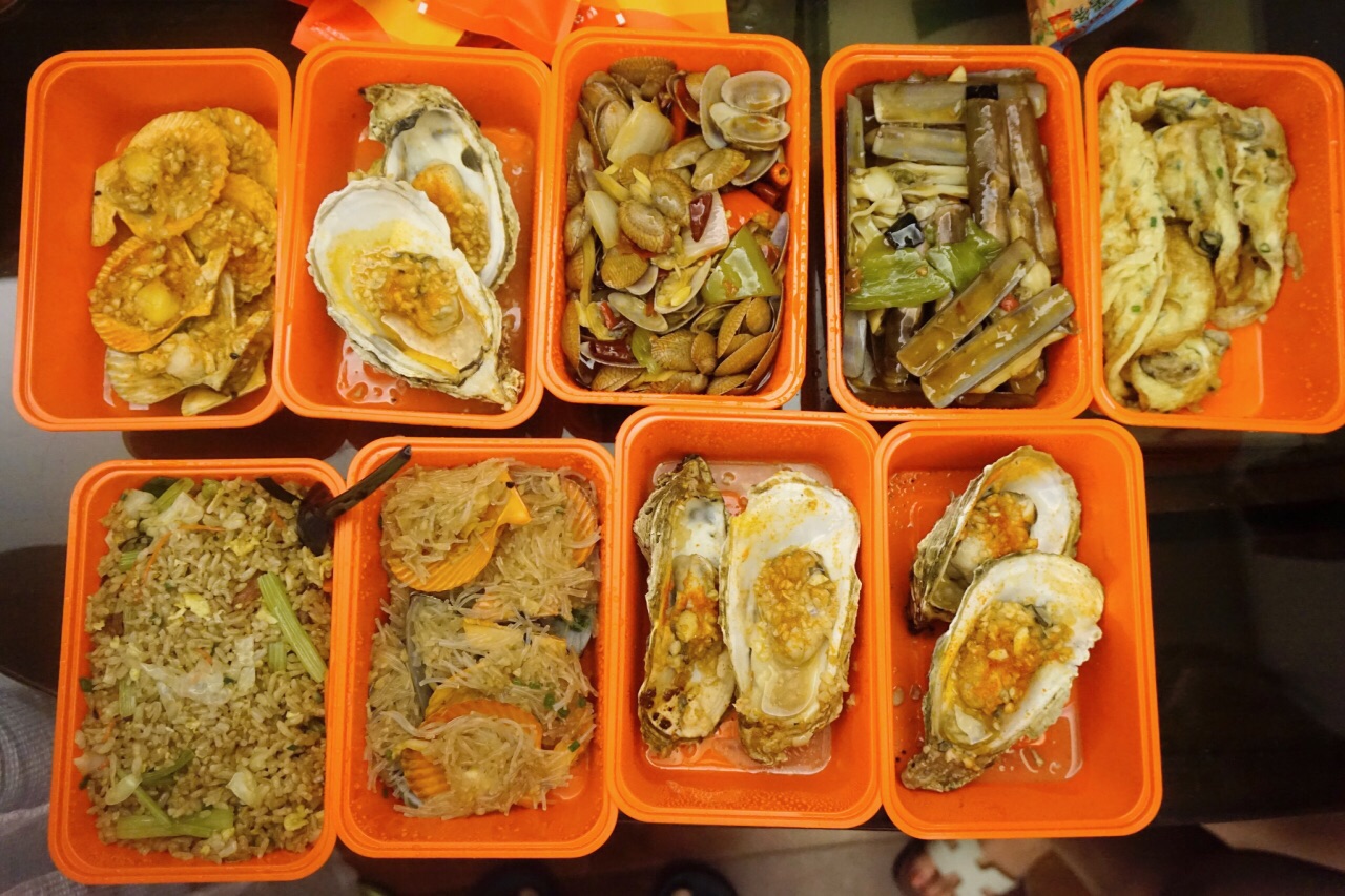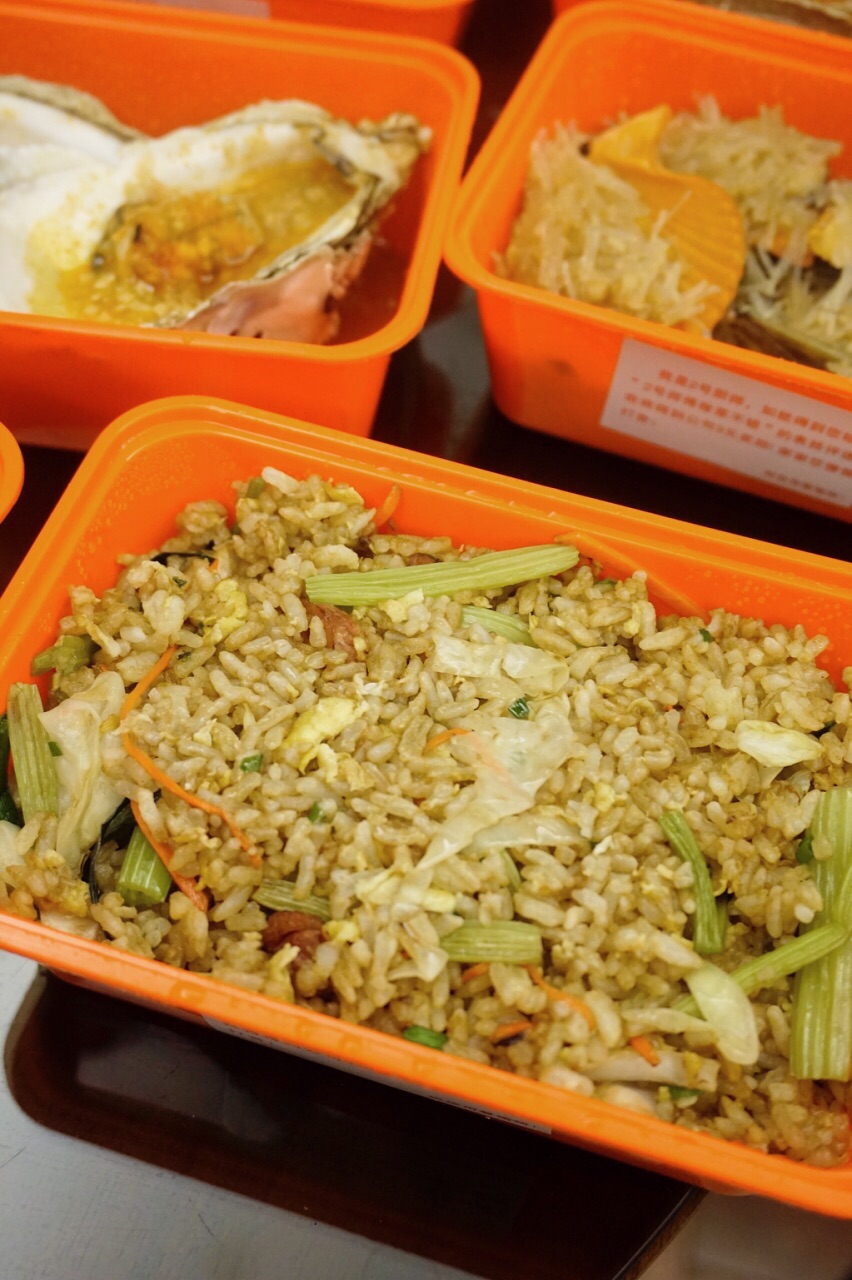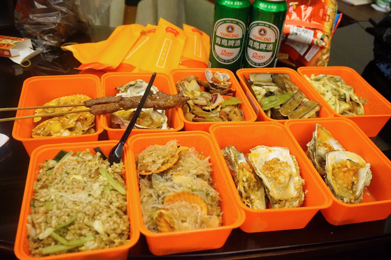 酒店里面点的一顿宵夜,怎么红帽子老是要记成小红帽呢?看了一下点评感觉还不错的样子。 菜品还算丰富,点的海鲜送到的时候都还是热热的,保温效果很好嘛,海鲜最怕吃冷的了。 【海南炒饭】20,好多炒饭都以地名命名,所以这个也是因为名字印象特别深。食材蛮多的,鸡蛋,芹菜,莲白,腊肠好像还有有点小海鲜……米饭干香粒粒分明,咸淡合适,好吃。 【扇贝】和【青口】都是4元一个【生蚝】8元一个。这些本身的品质都比较一般,肉头都很少,只能说味道比想象中的好。 【炒蛏子】和【炒花甲】味型一样,我觉得炒蛏子更好吃些,因为感觉肉更大块更赶口一些。 【蚝仔煎蛋】40,这个煎蛋也挺香,蚝仔比较多,就是吃到后头感觉有点点儿油腻。 大家边聊天边喝酒边吃海鲜不知不觉还是吃完了,作为宵夜也分量也是够的,甚至还有些罪恶。点了这么些海鲜啤酒加上送货费330+