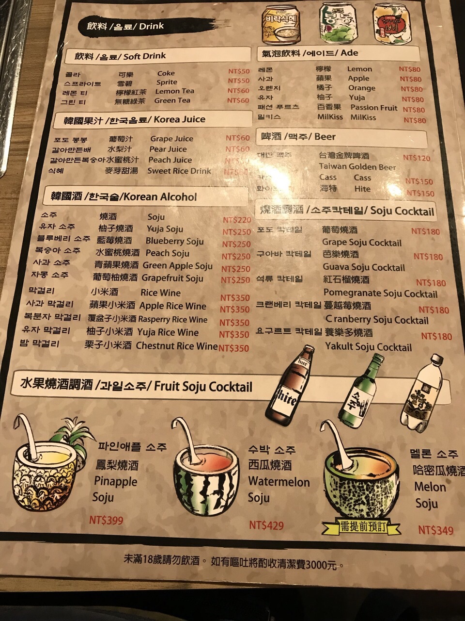 一人吃了800元台幣,水果燒酒很特別也好喝,建議一定要點,而水果燒酒中的哈密瓜燒酒若要點必須提...
