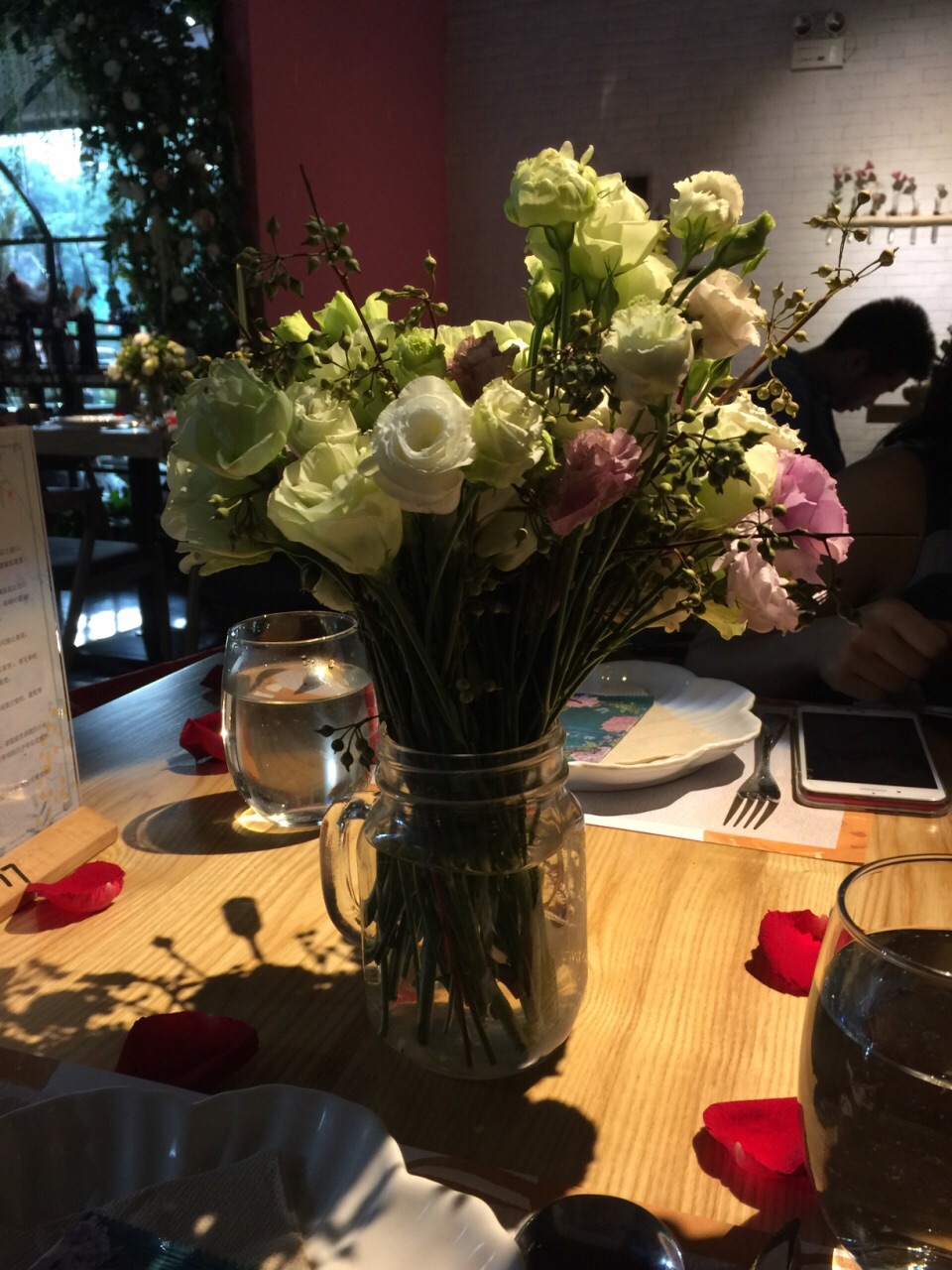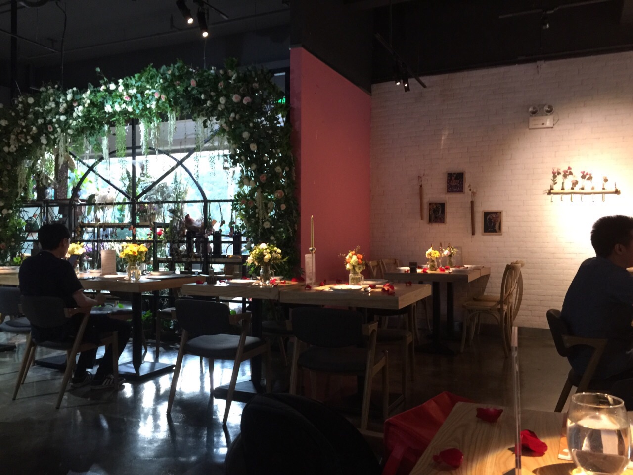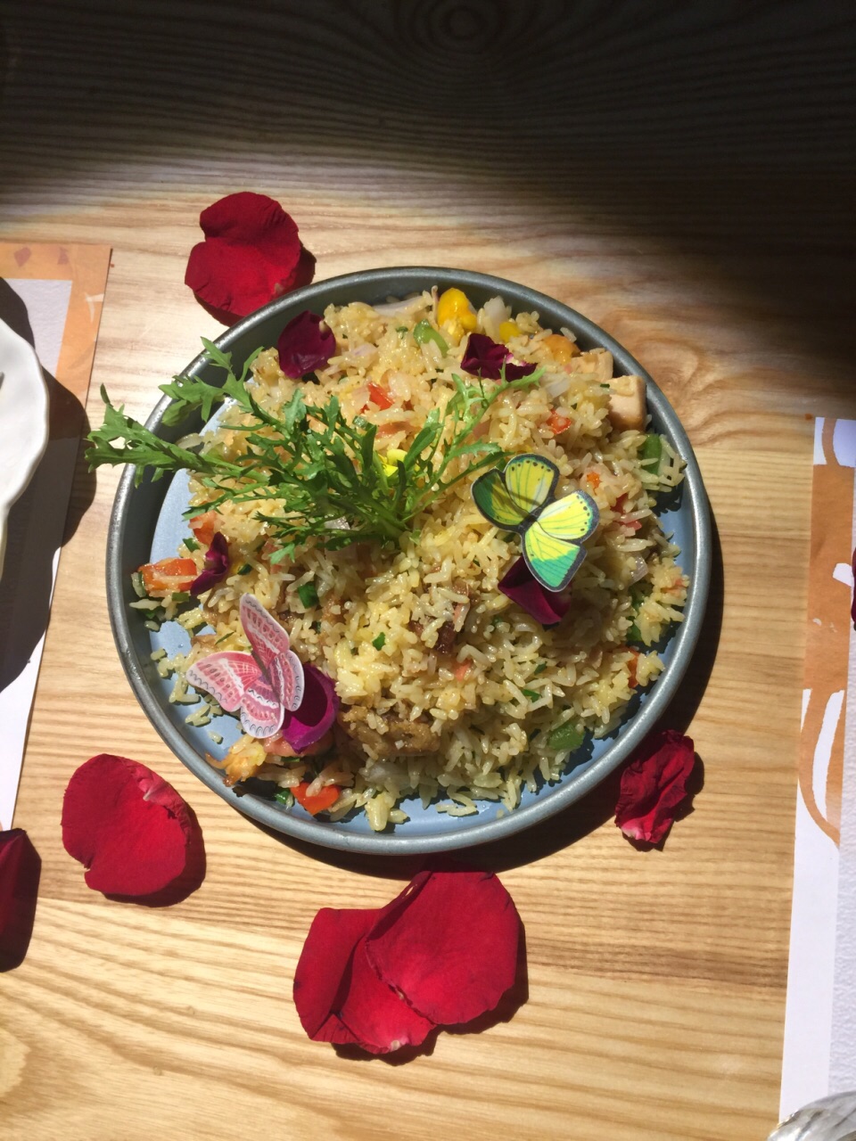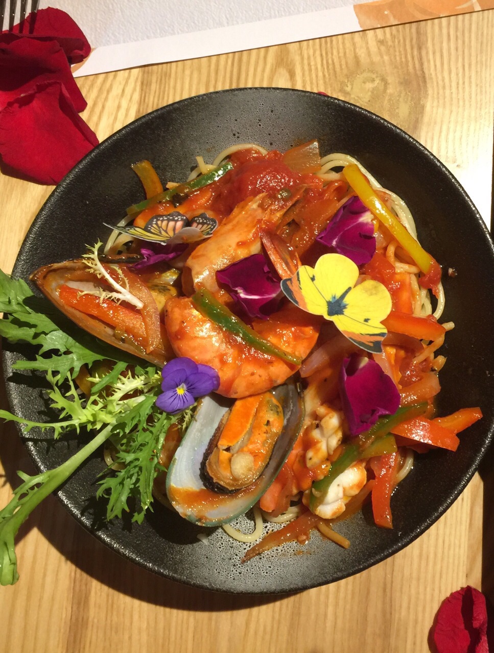 环境很不错,到处都能看到花,包括桌面都洒满了玫瑰花瓣,是专门提供给人求爱求婚,生日,纪念日的好地方。食物出品也装饰得很美,每盘菜都有花蝴蝶,当然是假的,味道一般吧,主要来吃环境,挺舒服的一个聚餐环境。可以来体验一下!