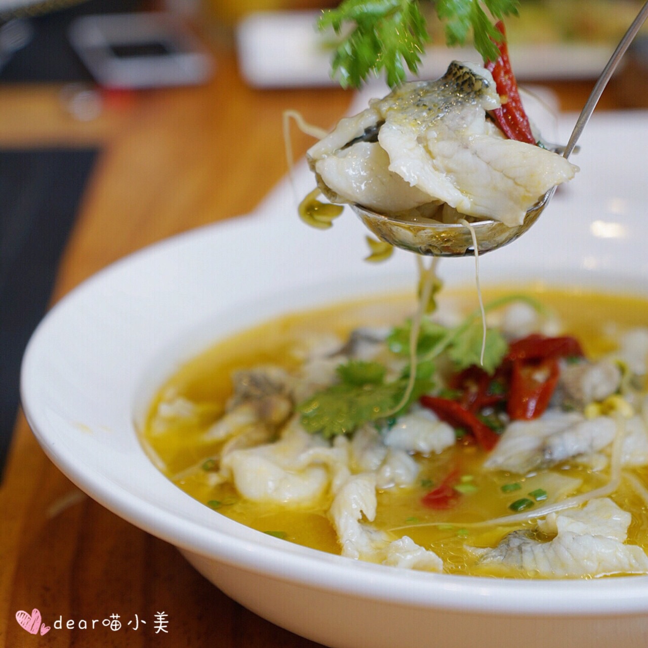 酸汤鲈鱼,酸辣劲爽的米饭杀手,鲈鱼肉十分娇嫩,带皮有胶质的部位口感一级棒,下面的配菜也很入味好吃