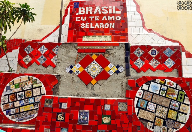 智利艺术家收集了各种马赛克瓷砖砌成的台阶,有几块还画着中国图案。导游说那个街区不是很安全,贵重物品不要拿出来。色彩丰富。