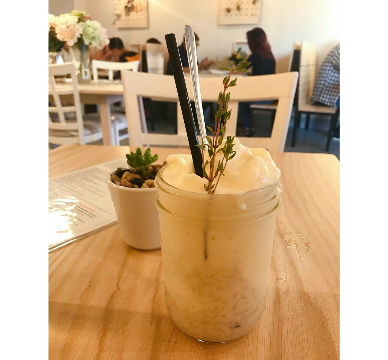 当当当!我自己去吃了这家美美的泰国菜! 果然!很好吃!!!推荐给大家! 装修风格超级清新,淡雅,但又设计感十足,给人感觉特别舒服,加分! 冲着甜品来的,在芒果沙冰和榴莲沙冰中纠结了很久,最后选择了榴莲的。满足!好吃!榴莲味道非常足!沙冰打到绵密和榴莲完美融合,底下是糯米