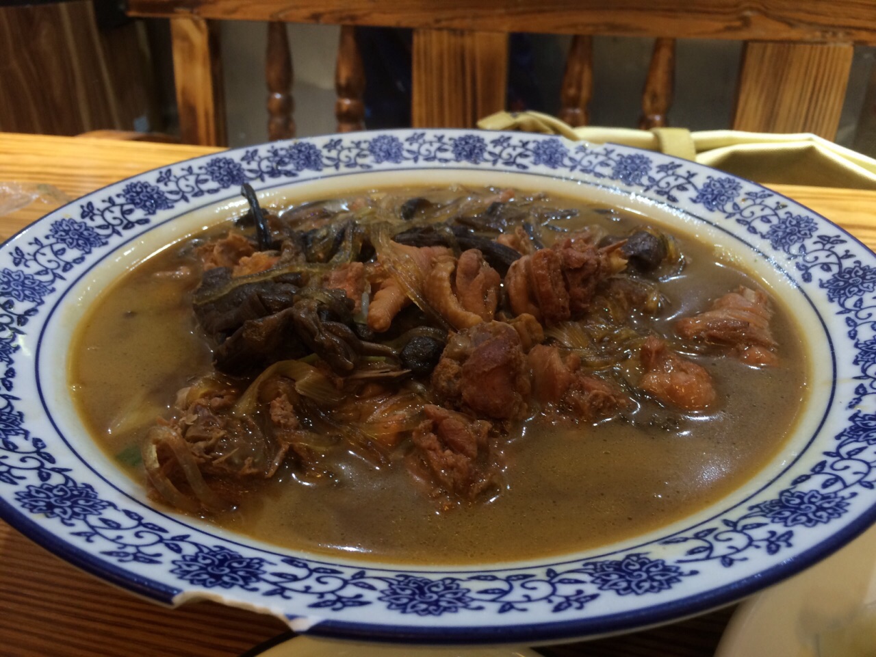 某人说还不错,带我来尝尝。 【韭菜猪肉水饺】:味道还行,就是馅剁的不够细,猪肉比例也不算高。 【小鸡炖蘑菇】:某人想吃,结果被自己噎到了。看着不是很有食欲,但是据说味道还行。 【椒盐小土豆】:味道不错,算是最好吃的一个菜,量很大,两个人吃吃不掉。 【东北溜肉段】:一直想吃的一个菜,发现还是锅包肉更好吃,溜肉段偏咸。 【西红柿鸡蛋打卤面】:据说卤打的不错,但是面条不好吃,不筋道吧。