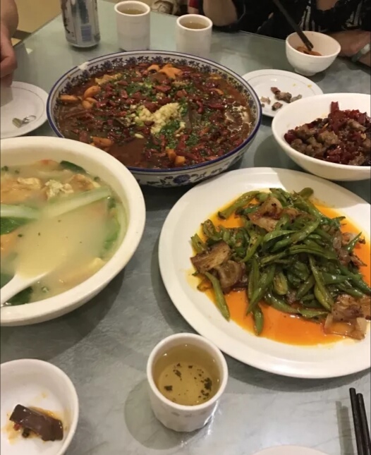 点了几个菜 辣子兔 蛮好吃的 花生很香 肉干爽 很适合下酒 毛血旺 血旺材料不错的 不是那种一抿就烂的 里面配的有千层肚 豆芽 入味 看起海椒多 一点都不辣 尖叫回锅 肉是那种肥瘦相间的 蛮香 总体来说菜品味道都还不错