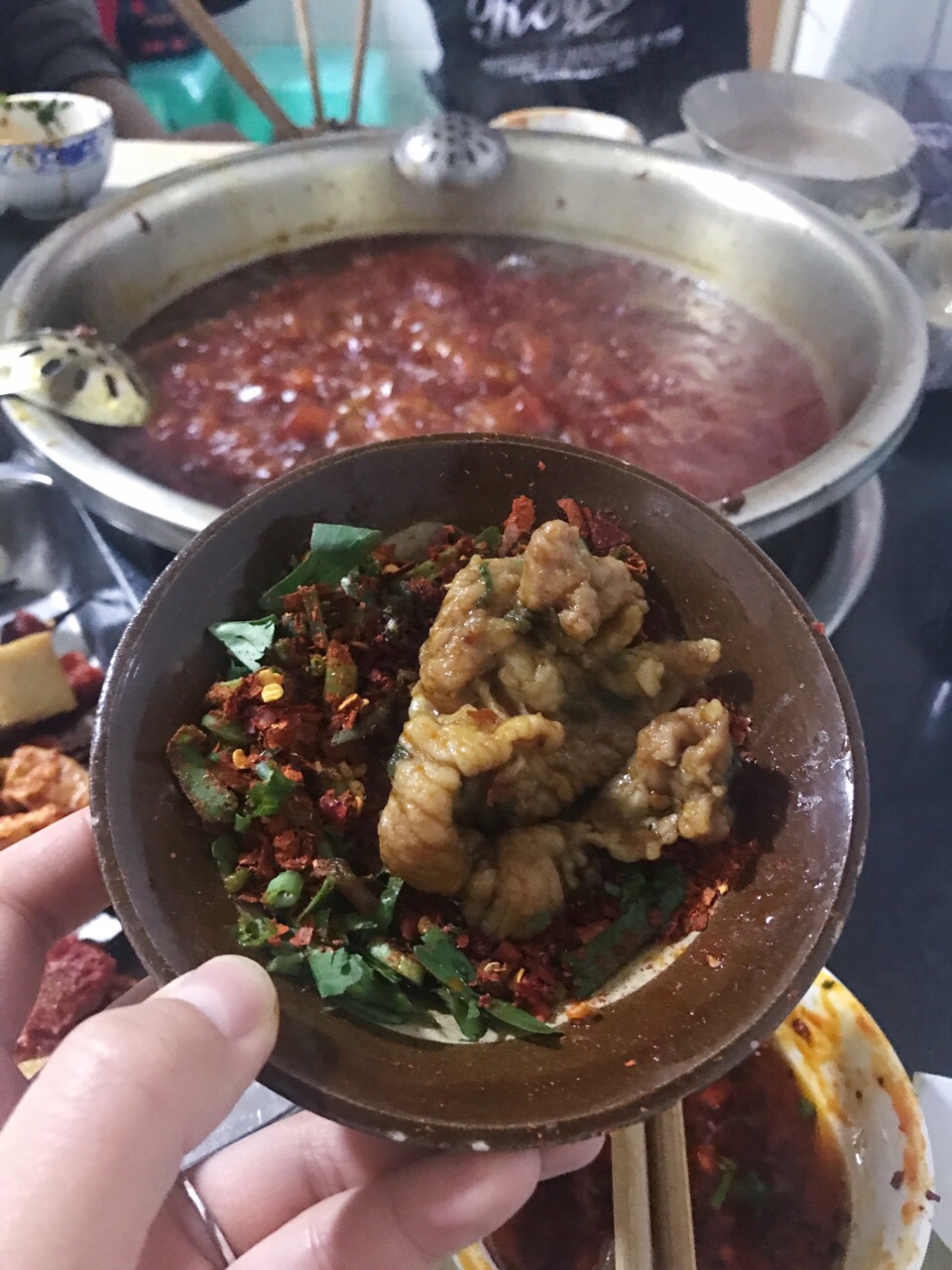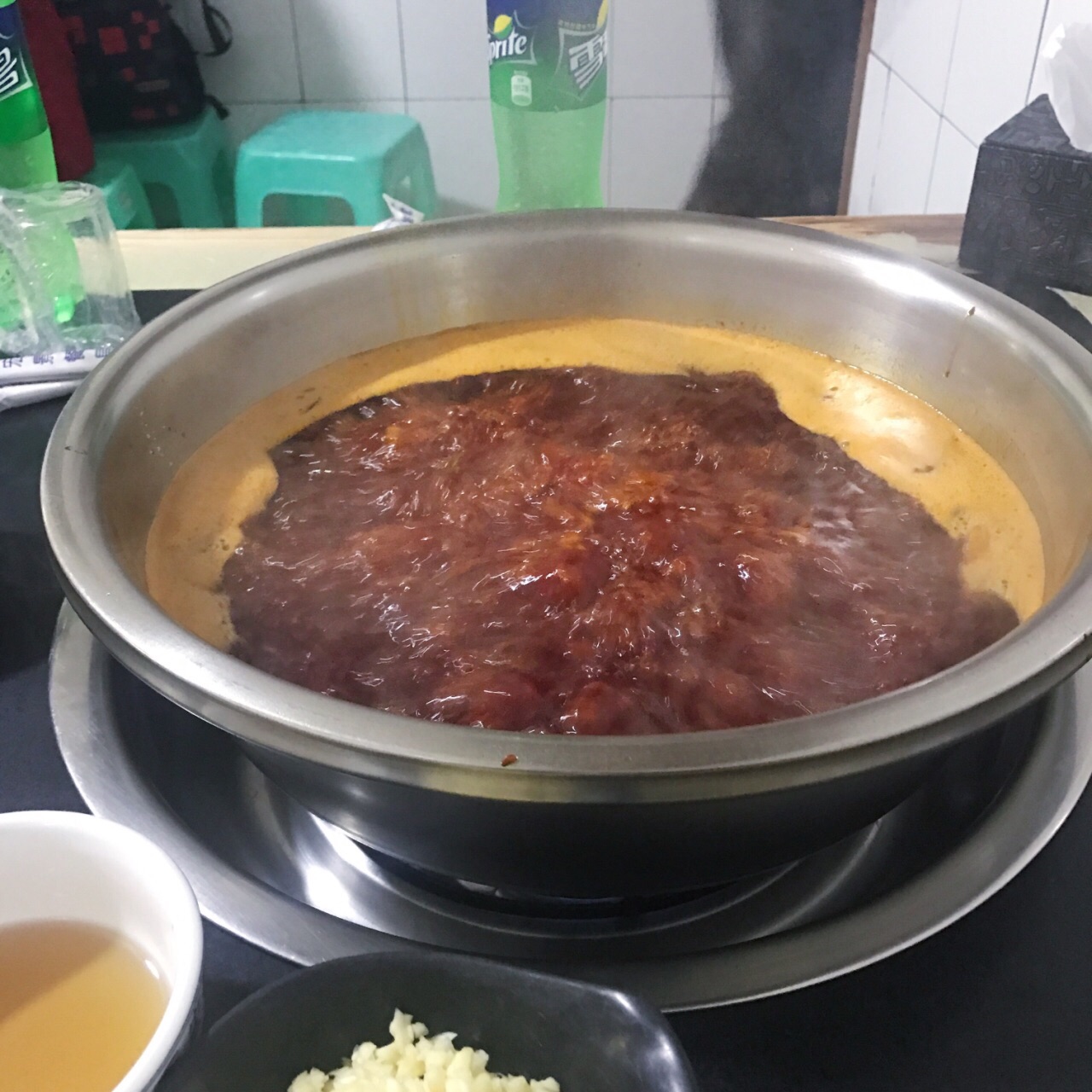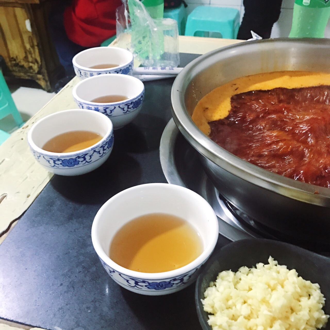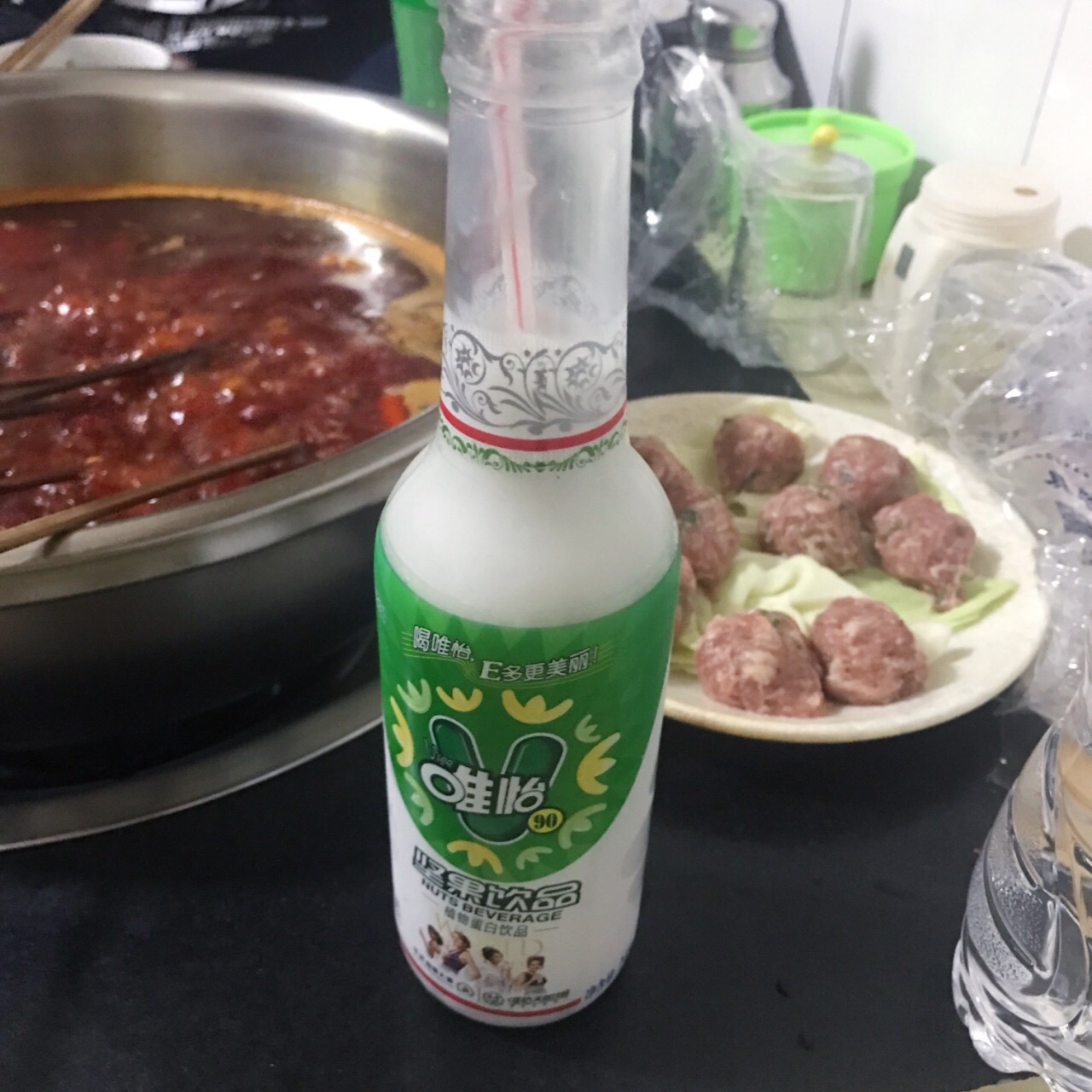 隐藏在一个居民区里,跟着导航走了一会儿,沿途经过一条美食街。锅底很香,因为太辣喝了两瓶唯怡豆奶