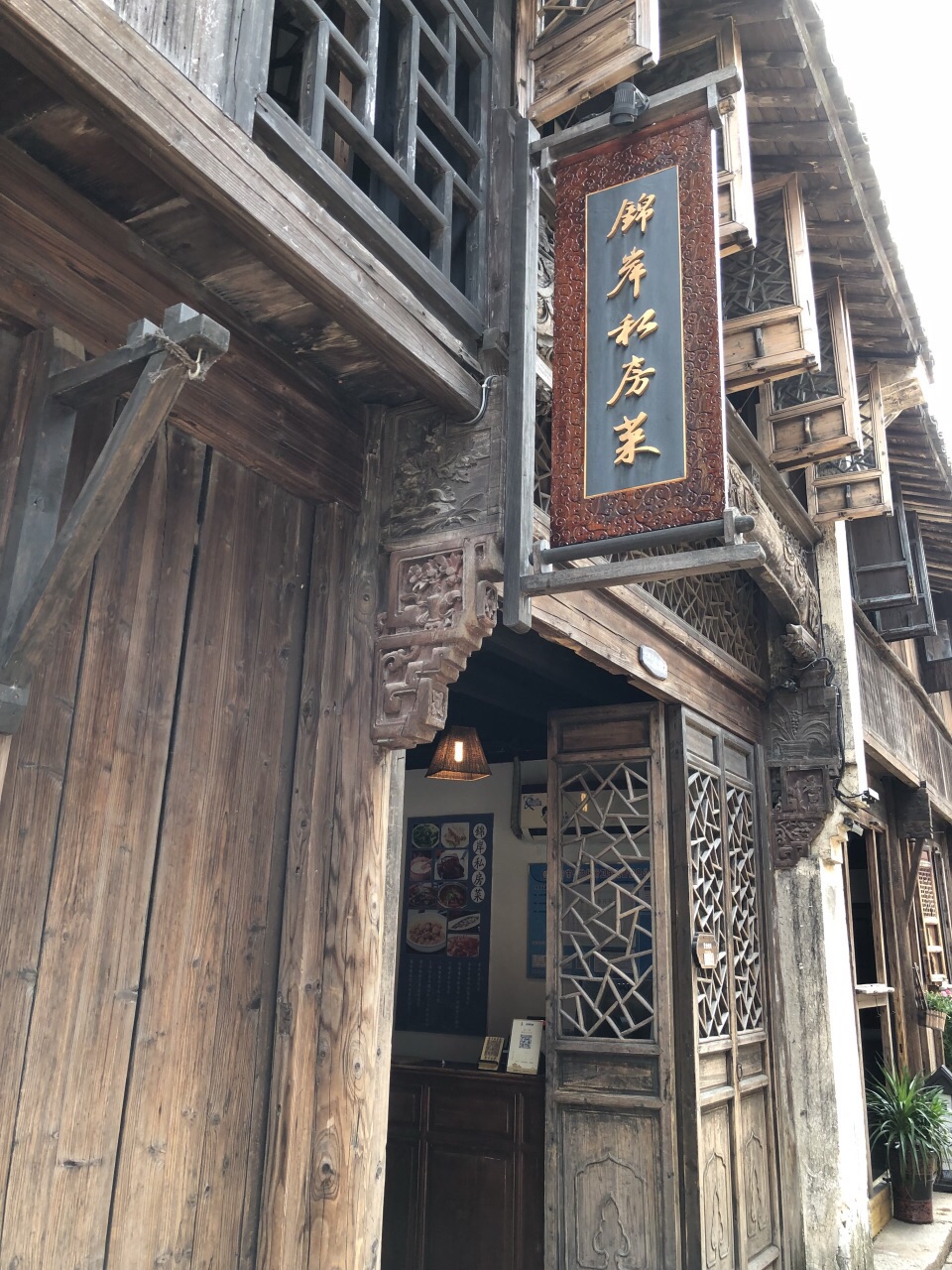 西栅大街上的锦岸私房菜居于大街中段,临河,网上评价不错。在西栅的晚餐就准备在这儿吃了。去了告知没有临河的座位了,让我们去别家看看,只有走人。不甘心的我们第二天去吃了午餐,终于坐到了临河的座位。这家店是扫码点菜,只显示当天有的菜品。点了四个菜:酱骨头过老酒、小青菜爆猪肝、小炒河鲜、臭豆腐,味道尚可,菜价偏贵。其实也不一定要选临河的餐馆,在西栅看河景是一件很容易的事儿。