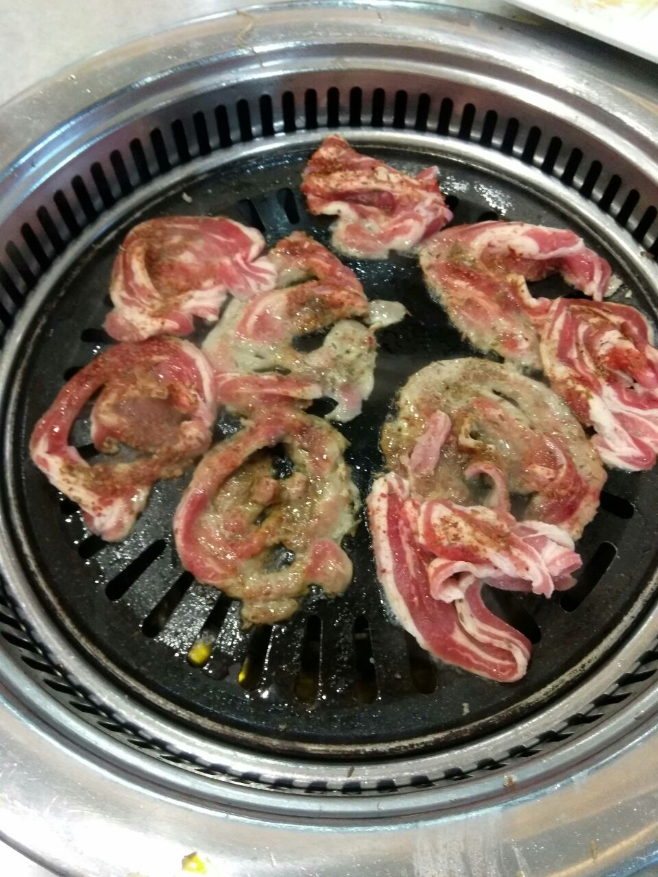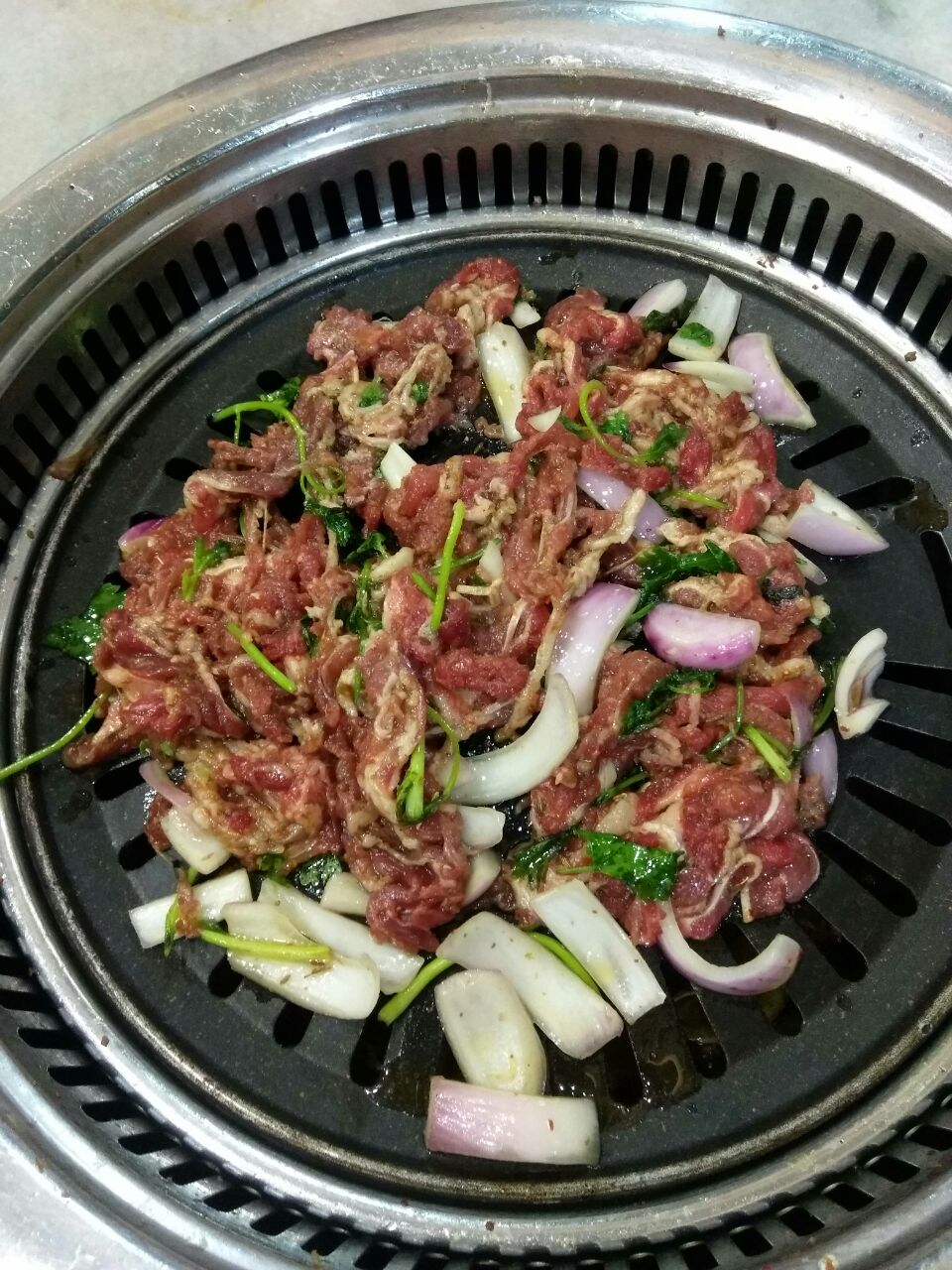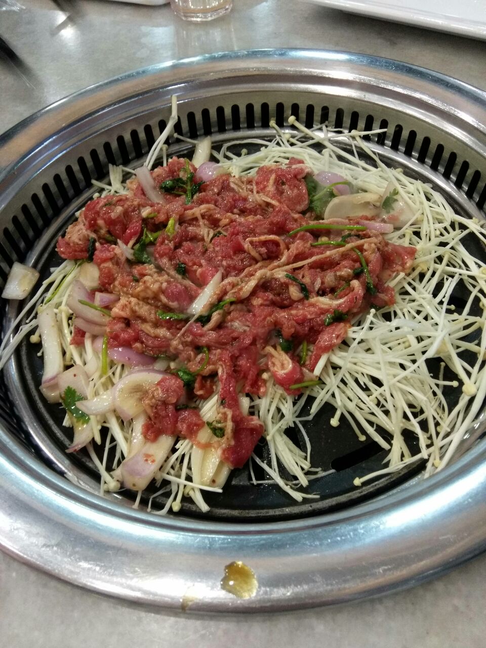 这家餐厅的烧烤还是很不错的,餐厅里座位基本上都坐满了,来晚的只能选择室外了。上菜还比较快,基本上是东北风味的烧烤,冷菜也是东北凉拌菜为主。 烤肉时将洋葱放在里面一起烤还是不错的,洋葱既解油腻,又防止肉烤焦。 金针菇和肥牛一起烤味道不错,牛筋有些老。 总体感觉还不错,就是餐厅门口没有停车位,停车不方便,边上收费停车场的工作人员很态度恶劣。