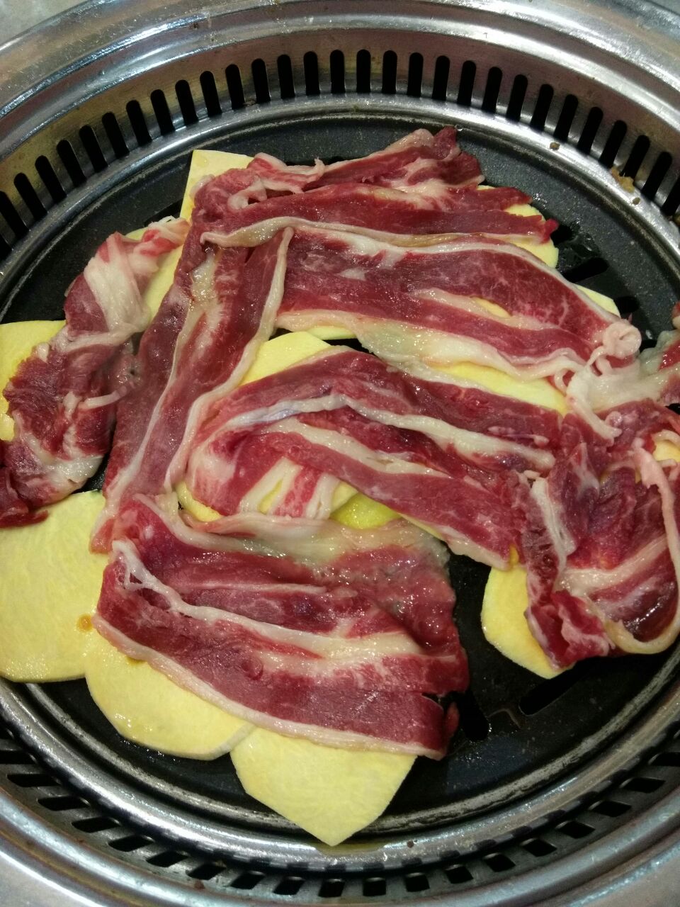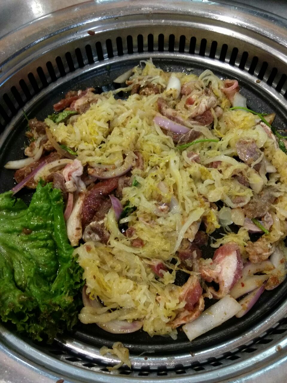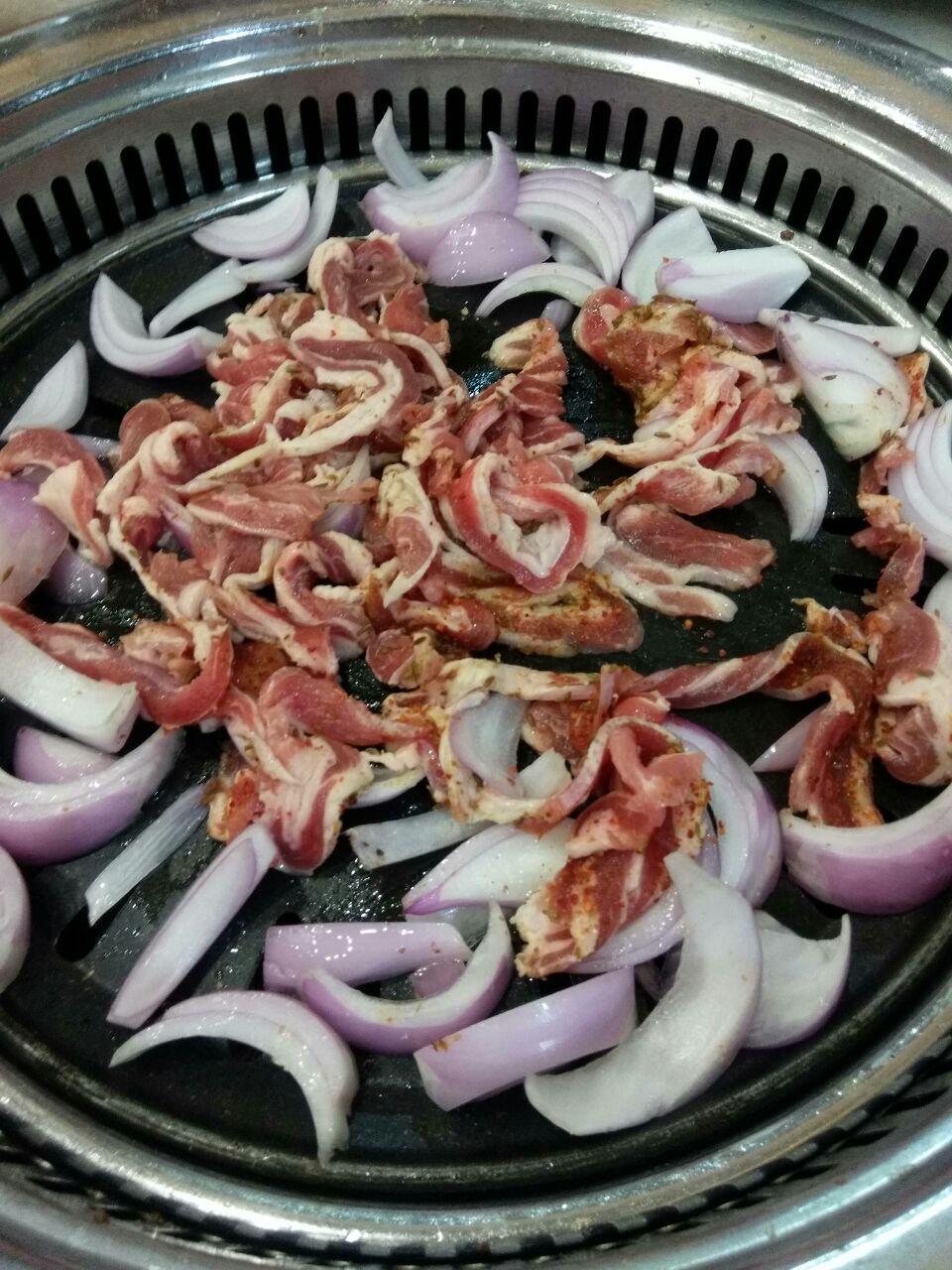 这家餐厅的烧烤还是很不错的,餐厅里座位基本上都坐满了,来晚的只能选择室外了。上菜还比较快,基本上是东北风味的烧烤,冷菜也是东北凉拌菜为主。 烤肉时将洋葱放在里面一起烤还是不错的,洋葱既解油腻,又防止肉烤焦。 金针菇和肥牛一起烤味道不错,牛筋有些老。 总体感觉还不错,就是餐厅门口没有停车位,停车不方便,边上收费停车场的工作人员很态度恶劣。