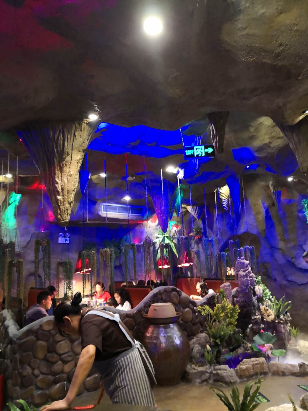 所有的执念都是源于对重庆火锅的深爱,一锅麻辣鲜香的红浪翻滚,配上脆嫩化渣的毛肚,爽脆弹牙的鸭肠,还有那丝丝入味的郡花,薄如蝉翼的腰片,豆香浓郁的私房豆腐,,,,,,,简直承包了我一整年的味道向往。 这一家特立独行的火锅店,让我对火锅有了不一样的认知:原来除了味道和菜品,环境也是如此重要。在这样的山水溶洞吃火锅,没有呛鼻的火锅辣味,只有香味;人很多也不觉得嘈杂,据说是装修材质吸收了杂音;更让人觉得舒坦的,是在这样的洞天福地一瞬间短暂的忘我,没有钢筋水泥森林的压抑,宛如置身神仙洞府,只需要用心体会火锅的美味。 老板其实不算很地道的生意人,没有斤斤计较的去计算坪效,500多平的店只做了27张台,宽敞舒适的宽板凳,没有其他火锅店的摩肩擦踵,即便在大厅聊天也不会受太大影响。老板也没有生意人的狡黠,买单的时候说送个饮料吧,老板憨憨的说好;说送个菜吧,老板还是笑嘻嘻的说没问题。我有一点点担心,价格本来就很实惠了,这样的话会不会亏本啊?老板憨厚的说:有一点点赚就行咯,大家开心就好。我怀疑是长期生活在这样的洞府里,是不是也修炼了心性哦。 好吧,咱们就来吃火锅,顺便修个仙咯!