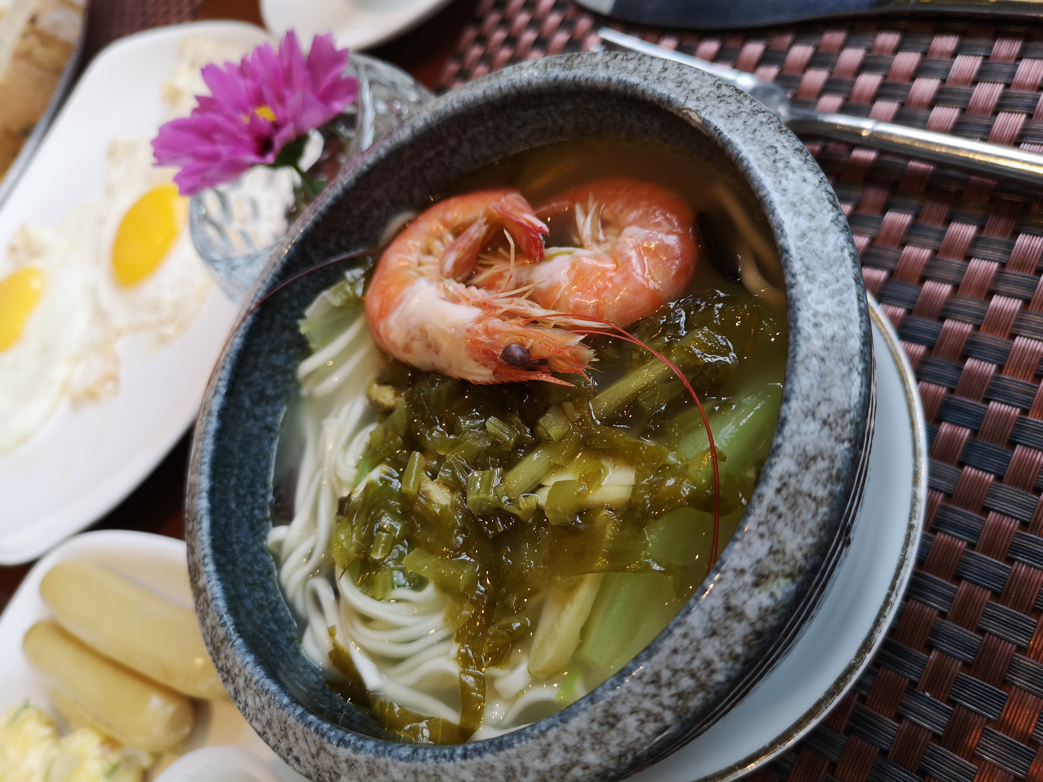 入住望津里酒店,这家餐厅是早餐使用的餐厅~ 环境不错的,取餐区域很大,用餐区域和取餐区域是相对独立分开的~ 沿湖的餐厅,所以在这里用餐环境上加分不少~ 服务也挺好的,工作人员很NICE的问候早安~ 早餐的食物提供不算很丰富,但也绝对够吃的~ 面很好吃的,是工作人员当场现做的,然后根据自己口味添加调料,工作人员也会帮忙端上桌子~