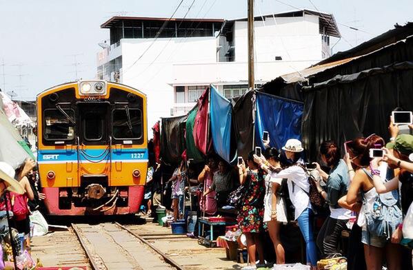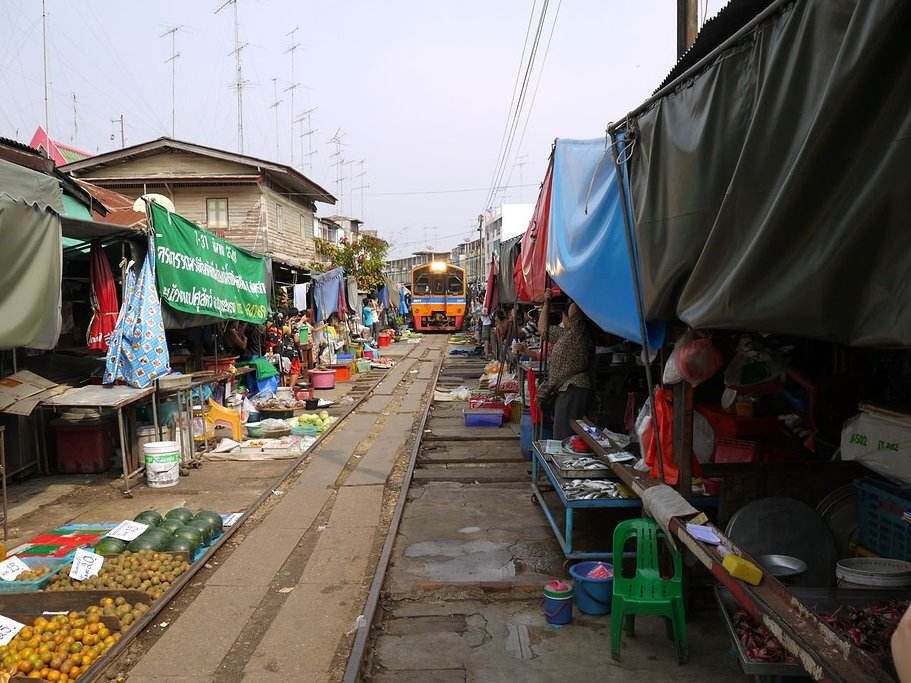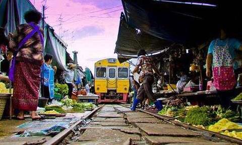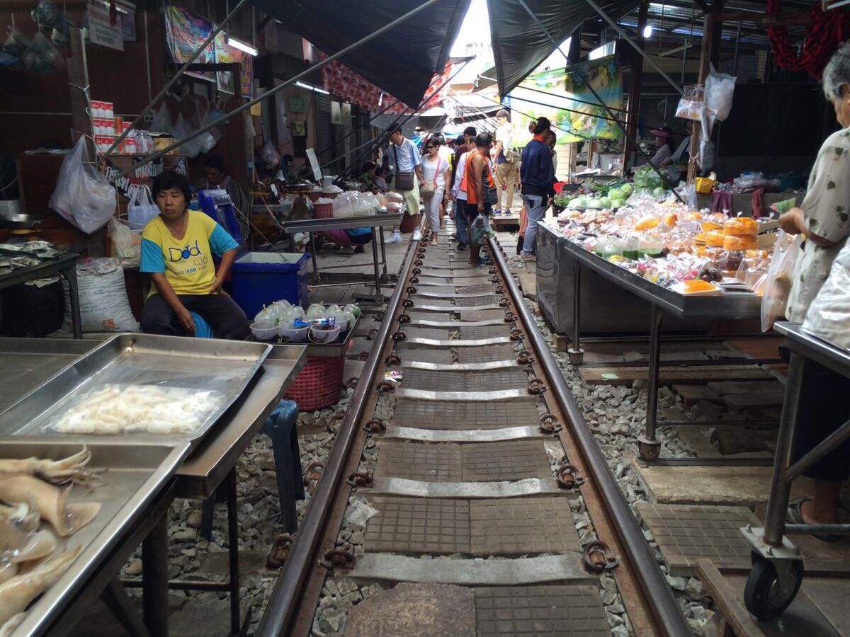 真的是非常有特色的一个景点了,很贴近当地人的生活,从曼谷市中心出发到美功铁路市场,大概1个多小时车程。市场中商家摊主在铁轨的两侧摆摊,每天有列车经过,火车通过的时候,摊主必须将挡住火车的遮阳、货架收起来,等火车通过后再摆放回去继续做生意;虽说是市场,但除了是游客来参观游览,这里其实还真称不上:“市场”。而且重要也是买一些廉价的海鲜为主,能游览的地方也不多