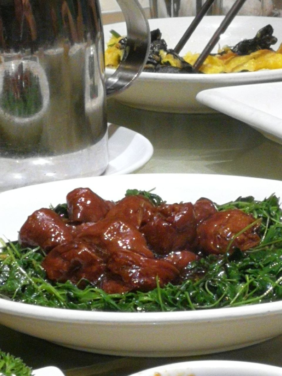 脆皮乳鸽皮香肉嫩很赞,草头圈子中规中矩,草头不老圈子实在,炝腰花没有腥气很嫩,小米煨海参蛮大份...