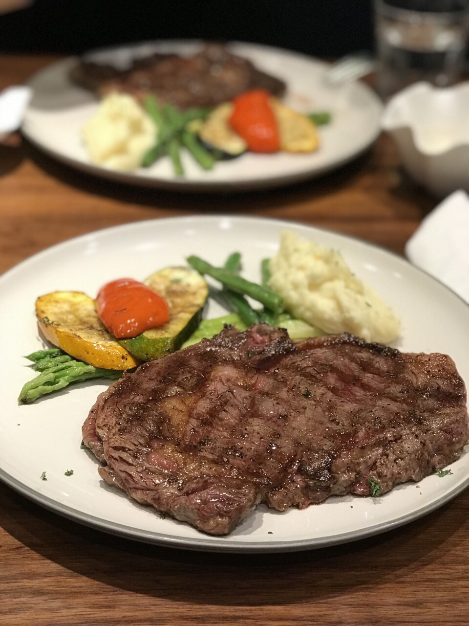 ...牛排是对的,因为开高速公路旁边有草地的话,经常看到很多牛羊成群,感觉这边的牛肉一定是非常好吃的在美国多吃点牛排是对的,因为开高速公路旁边有草地的话,经常看到很多牛羊成群,感觉这边的牛肉一定是非常好吃的。点了一块肉眼牛排,不是很厚,薄薄的,但是个头挺大的,一块下去估计有250克。