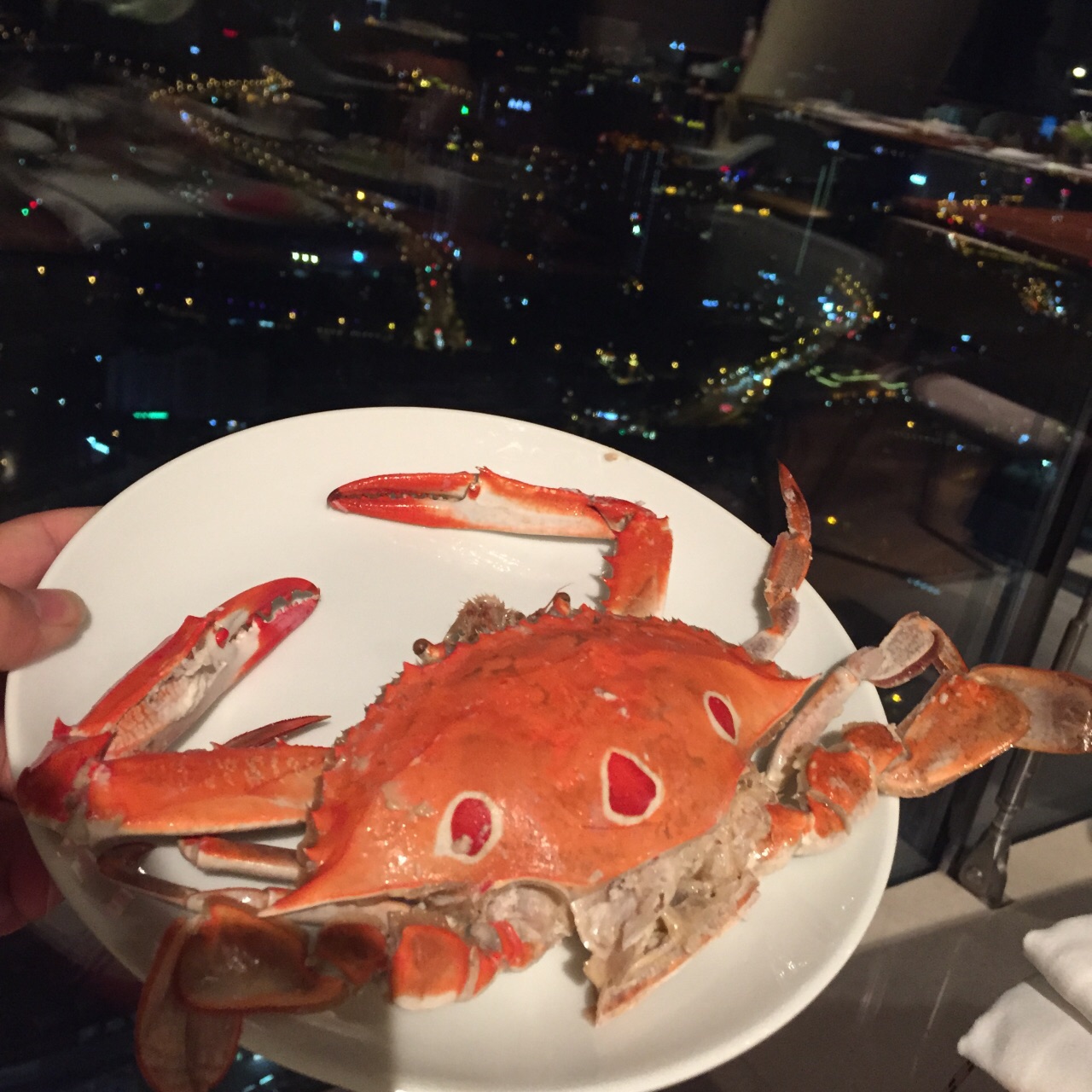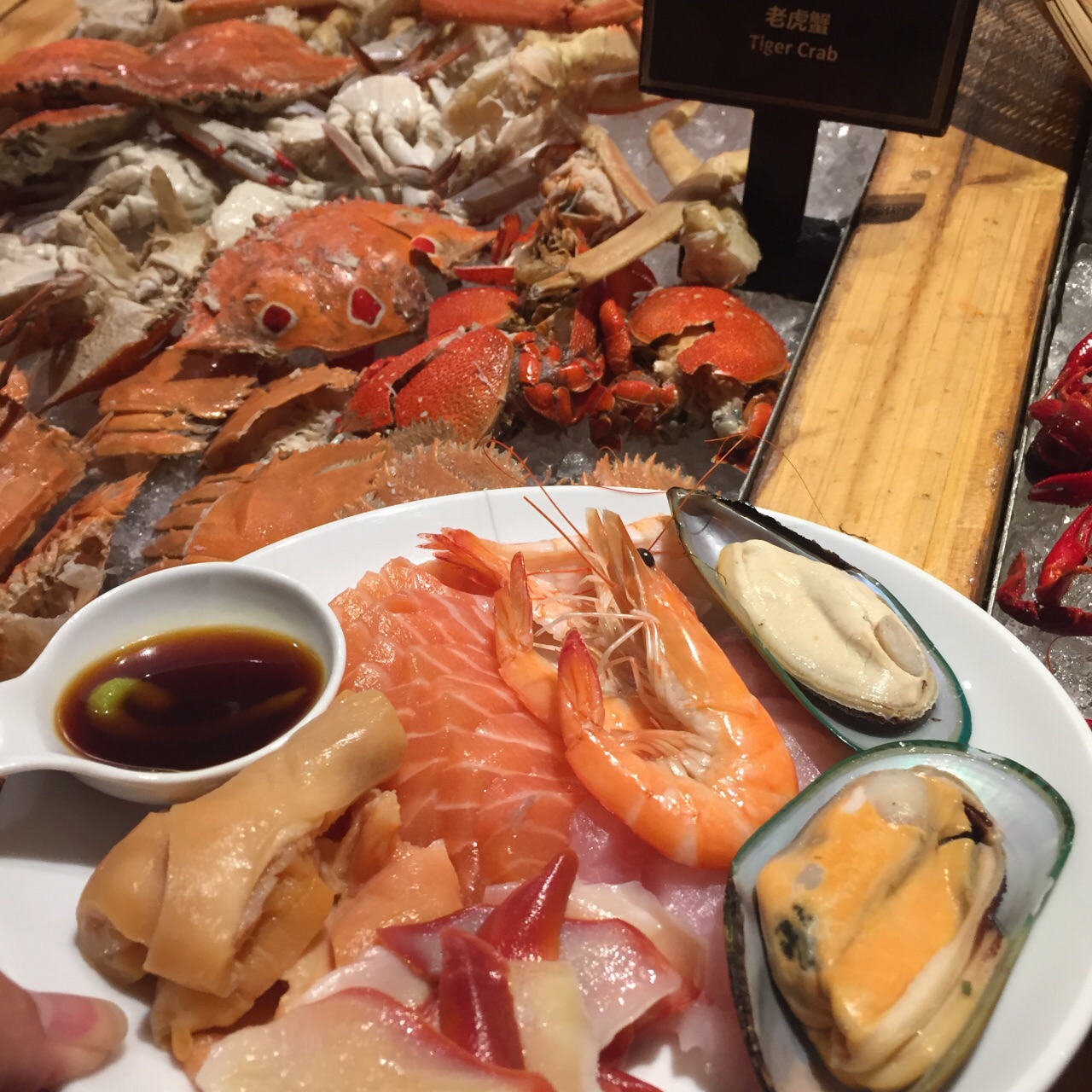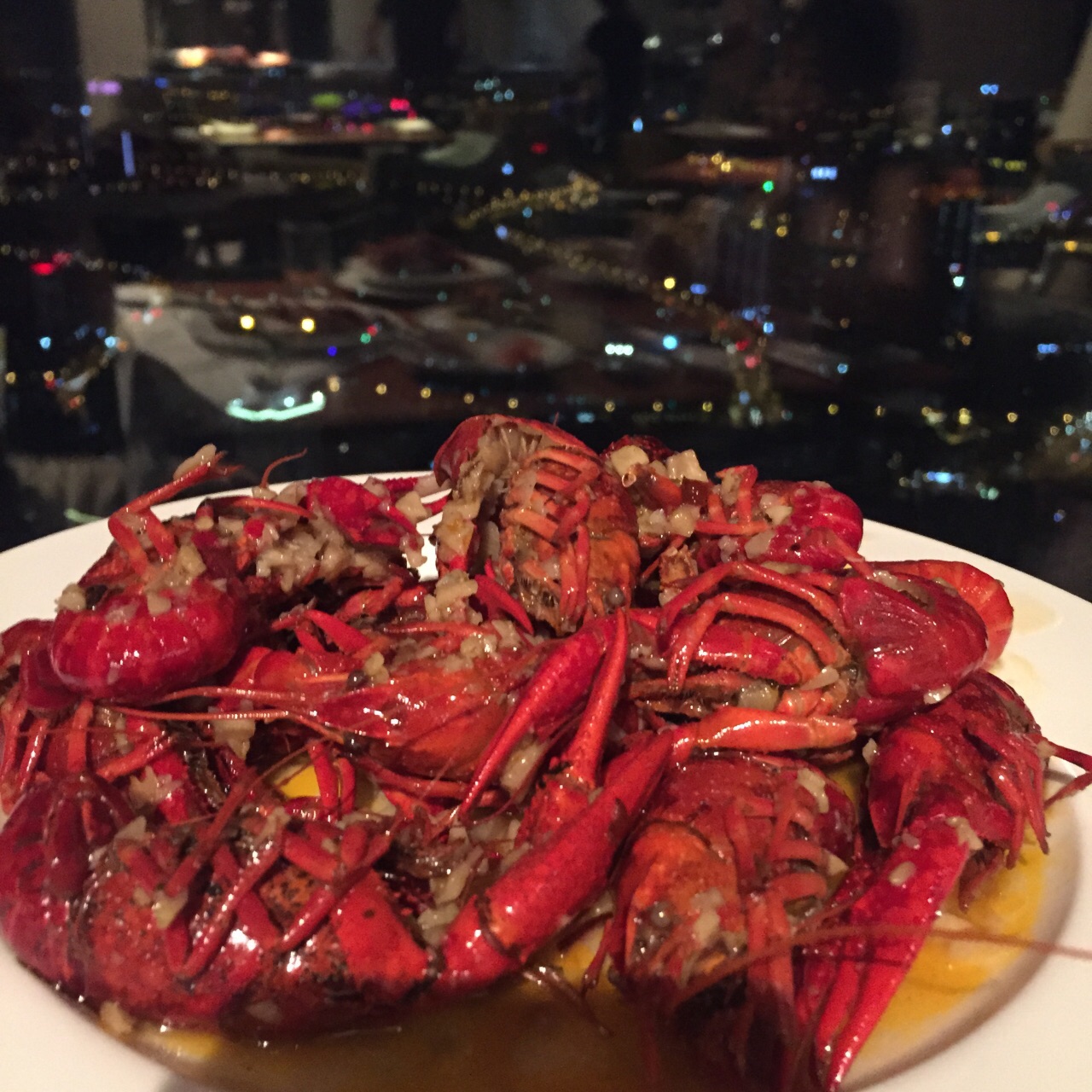 在64层高楼俯瞰锡城最繁华的景象,视觉上的享受远胜于味蕾的刺激。 从电梯出来就是咖啡厅了,前台引导入座后就没人管你了,自觉点取餐吧,别像我一样傻坐着。对了,没人帮你铺餐巾,毕竟不需另付服务费的。 俯瞰市中心的感觉很棒,登高望远,心旷神怡,更多表达不出的自行感受。 菜品数量不多,质量还行,比预期的稍好。 烤羊排肉质嫩,筋有点多,味道较淡,需蘸佐料; 刺身新鲜,三文鱼肉质肥美,鲷鱼口感清爽,北极贝爽脆,扇贝吃起来软糯; 小龙虾个头很小,肉质不紧实,感觉不太新鲜,没有评论的那么好。 铁板虾个头很大,闻起来像海虾,肉质紧实,酱汁味道好。 烤鸭是雷区,鸭肉油多、肥肉多,鸭皮不脆,肉质偏甜。 烤生蚝味道鲜美,个头小了点; 甜品随便选,感觉每一种都好吃,刷完一遍蛋糕冰淇淋,三文鱼就有点吃不下了饮料种类太少,没有鲜榨果汁,还好橙味气泡水比较清爽。 总体感觉还行,为了环境可以二刷。