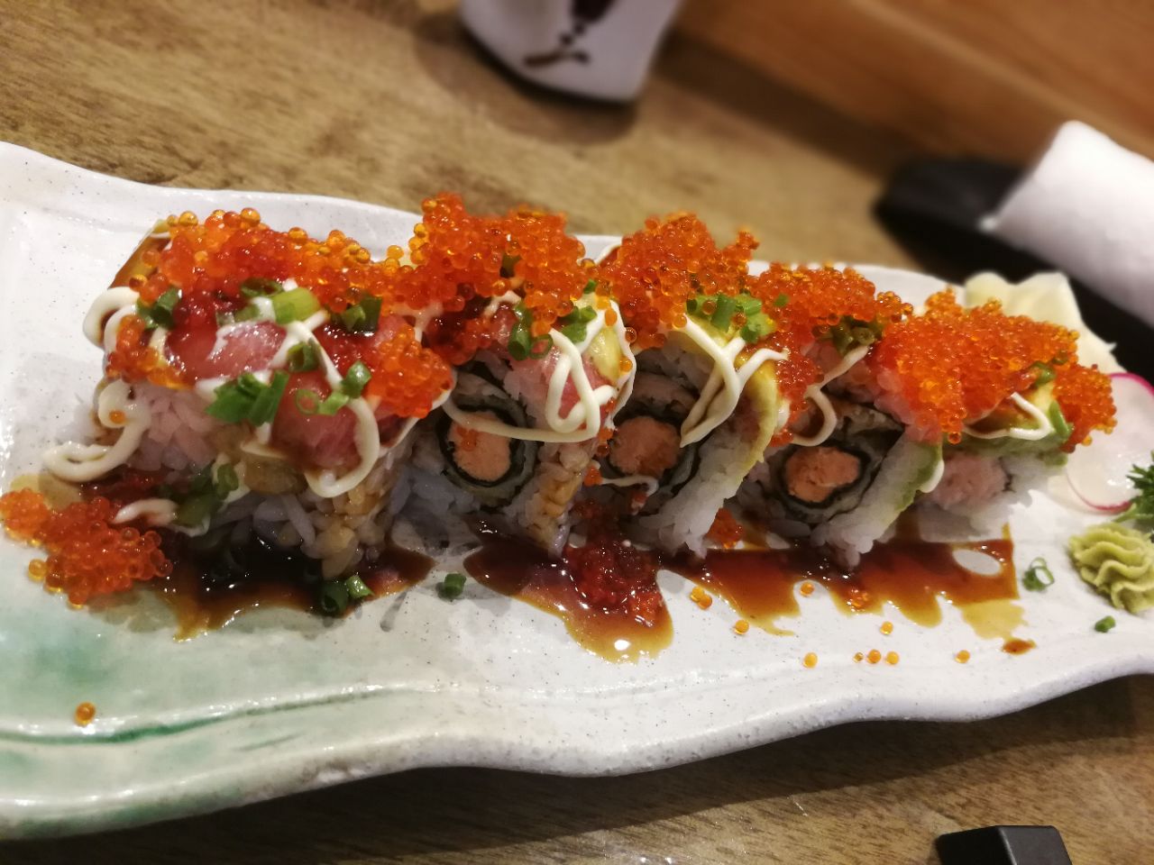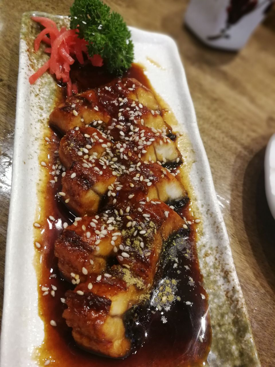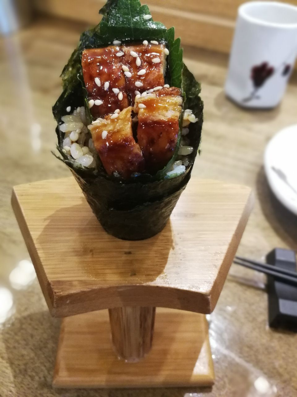 虹桥火车站旁边现在俨然变成了美食天地,对经常要乘火车的人来说,绝对是福音。今天找了家日料店,离常去的星巴克几步之遥。 点了一份烤鳗鱼,鲜香肥臾,淋上浓稠的酱汁,满口的幸福感。胃口小的人,可以选半份,比较人性化。 这里的手握卷做得很考究,脆脆的海苔包裹着米饭,像冰激凌蛋筒一样,插在一个竹架子上,趁热吃口感最佳,时间长了海苔容易软掉。