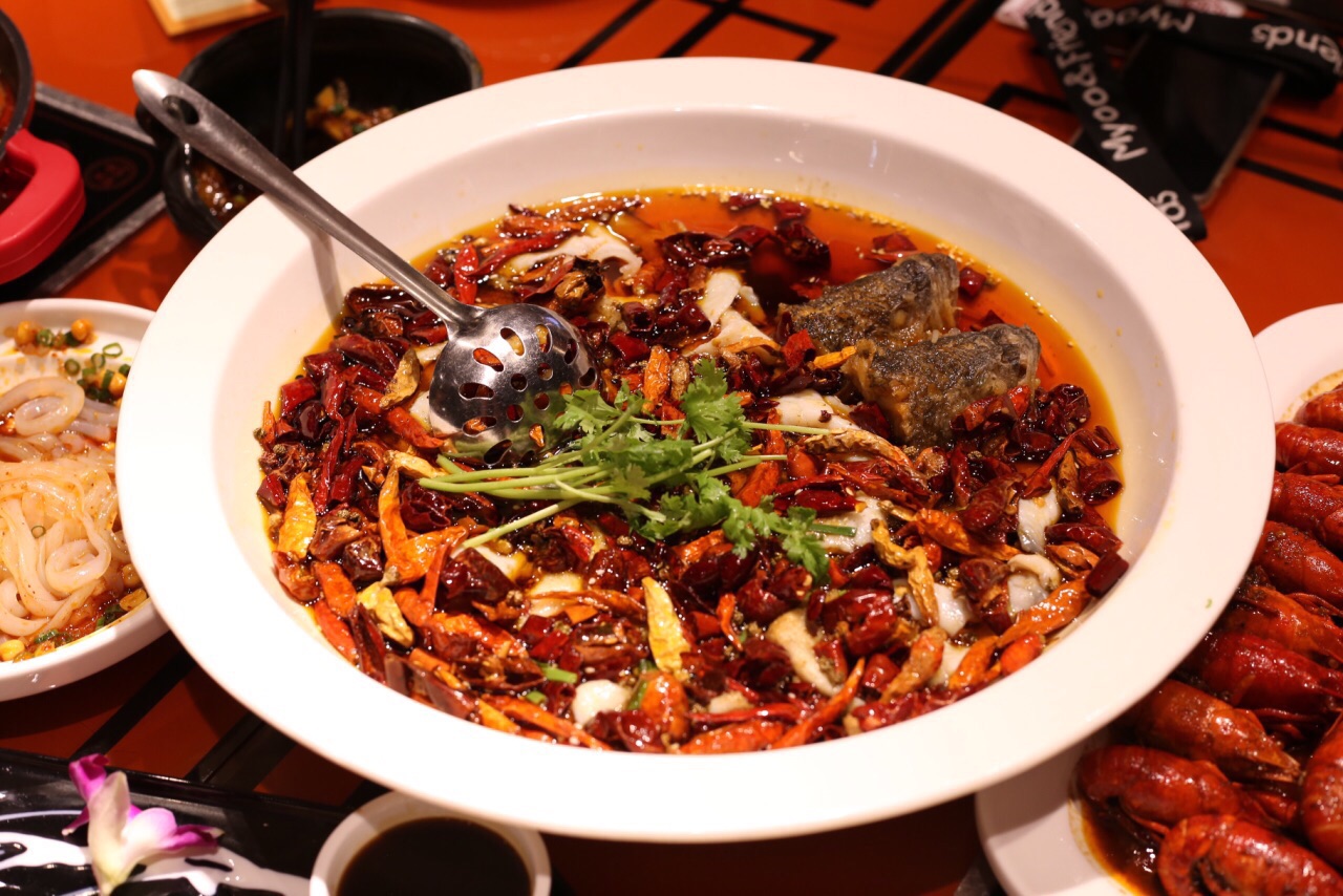 [环境]客村店比昌岗店好了不止一点点吖!古香古色的装修,干净整洁的大厅,独立宽敞的包间(需提前预定)很舒适惬意! [服务]很棒!入口有西施姐姐引导入内;由于没有提前订圆桌和包间,怕桌子太小不够放,服务员当场翻台拼桌,执行力棒棒哒!还有小哥哥免费赠送酸梅汁。赞! [出品]卖相好!分量实在!味道也是杠杠滴~首推「招牌毛血旺」这一口根本停不下来。他家的毛血旺是现煮的。菜式颜值就不低,荤素搭配食材很新鲜,味道也是出乎意料得好。「励志沸腾鱼」有皖鱼鲈鱼和江团三种可选。我们选用了鲈鱼,红彤彤一大盆端上桌就让人胃口大开。水煮鱼的肉质非常嫩滑,就连鱼头也处理得恰到好处!「吮指小龙虾」个头不算大,但肉质还不错。味道麻麻地!优惠促销~「烧椒皮蛋」原本以为会选用鹌鹑皮蛋,实则是普通的皮蛋切块,可能这样更入味儿吧!辣椒是真的挺辣的。重口味大拼盘,肯定少不了一份「小汤圆冰粉」和「双味糍粑」小汤圆有酒糟的味道,个人不太喜欢;糍粑一定要刚出炉就吃,香酥软糯很满足!「粉丝娃娃菜」和「菠菜沙拉」也是良心出品。喜欢吃素的千万别错过!