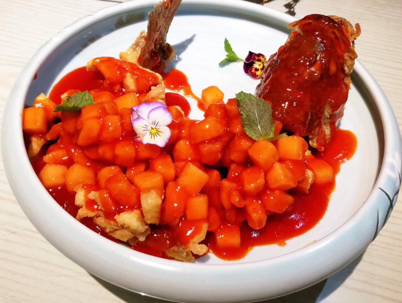 蓉玥藤椒鱼和沸腾鱼都很好吃,还有松鼠鱼和吊烧乳鸽适合不吃辣的,颜值也很高,他们家口水鸡、毛血旺都好吃