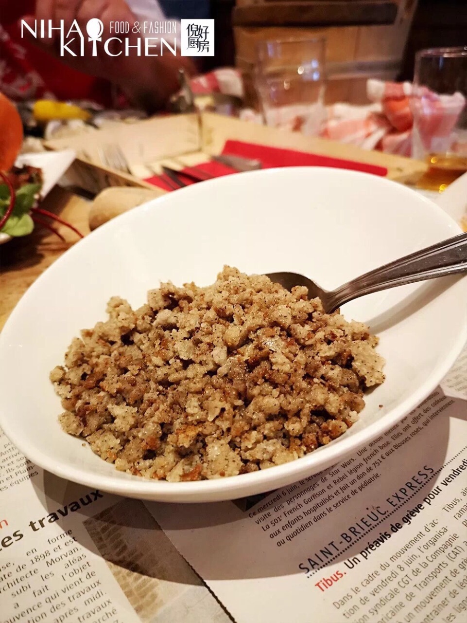 电影里,在码头的岸边上通常会开有这样一家小酒馆: 它的地板、桌椅、柜台一定都是色彩浓重的木质,就像是一艘扎根陆地的船;它的前台摆满了各种酒,它也将渔船上有的东西,诸如救生圈、渔灯等都搬到了酒馆内。 每天傍晚渔民收渔之后,会先在这家小酒馆里喝一杯,唠叨一下今天的收获如何,之后再回家。 Le Crabe Marteau便是按着这个模子刻出来的。 只不过它的菜单主角是螃蟹,而顾客则在渔民之外,还多了慕名而来的远方客。 而更有意思的一点是:Le Crabe Marteau桌上铺着的“桌布”是布列塔尼的地方性报纸法国西部报OUEST-FRANCE。 据说,用它做桌布,能使待会就要端上来的螃蟹吃起来更具布列塔尼风味。 如何豪迈地吃一只螃蟹 倪好 · 布列塔尼 Le Crabe Marteau内没有固定的菜单也没有储存海鲜的冰箱—— 你到餐厅之后能吃什么根据当天捕捞到的海鲜而定。而从海鲜被捕捞起到端上桌,中间的这段时间往往不会超过24小时,所以即使没有冰箱也能保证食材的新鲜。 在Le Crabe Marteau吃螃蟹,有两样工具少不了:一个是用来砸螃蟹腿的锤子,另一个是系在胸前的围兜。 餐厅的螃蟹体型甚大,据说来自深海,也较少活动,所以浑身储满了蟹膏,吃起来细腻绵密,入口即香。 藏在蟹钳内的蟹肉则是另一番滋味。吃的时候需要先用锤子将外面的硬壳砸碎,之后便能吃到鲜嫩甜美的蟹肉。 而吃螃蟹也有很多搭配的吃法:比如搭配香槟,让香槟的酸度降低蟹膏的腻滞感,同时也带来另一种特殊的香味;再比如搭配餐厅微辣的酱汁,在丰富口味的同时又不抢去蟹肉的鲜味。 除了主角螃蟹之外,Le Crabe Marteau的其他食物也同样美味。 比如生蚝。肉质洁白肥嫩,口感爽脆,吃起来在鲜咸中又有浓郁的蚝味。 比如龙虾。在对半切开后,撒上胡萝卜、青豆以及香料一起烘烤,蔬菜的鲜味与香料的芳香被一齐催入肉中,所以吃进去的每一口都别有风味。 而主食也很丰富,除了传统的面包之外,还有用木桶装着的土豆和带着螃蟹味的黑麦团可以选择。 第一个吃螃蟹的人,或许确实可以算上是一个勇士,但在具备了勇气之外,他还应当是个擅长发现的人——擅长发现大自然毫无言说便给予我们的美味。 毕竟谁能想到这种“双螯八足,形状凶恶的甲壳虫”,在坚硬的外壳底下竟藏着如此丰腴圆润、丝丝鲜嫩的美味呢?