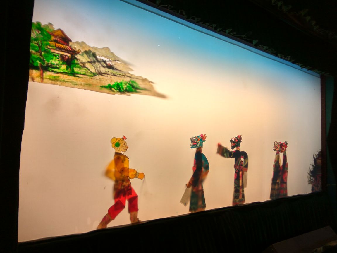 对于建筑前面的那些和江南有关的摆设不是很在意,直接奔向后面的皮影戏馆。 皮影戏的的表演时间是固定的,但是也要看游客多不多,三三两两的游客,后面的师傅也是不会表演的,还好我们是一堆人进去的。 表演的内容也无外乎一些经典的内容,比如西游记。一个师傅操作两个以上的皮影偶人,伴着音响节奏开始舞动袭来,偶然师傅还会吆喝两声,热闹极了。 皮影鲜艳的色彩,即便隔了一层幕布也一样鲜艳,很吸引小孩子的目光。