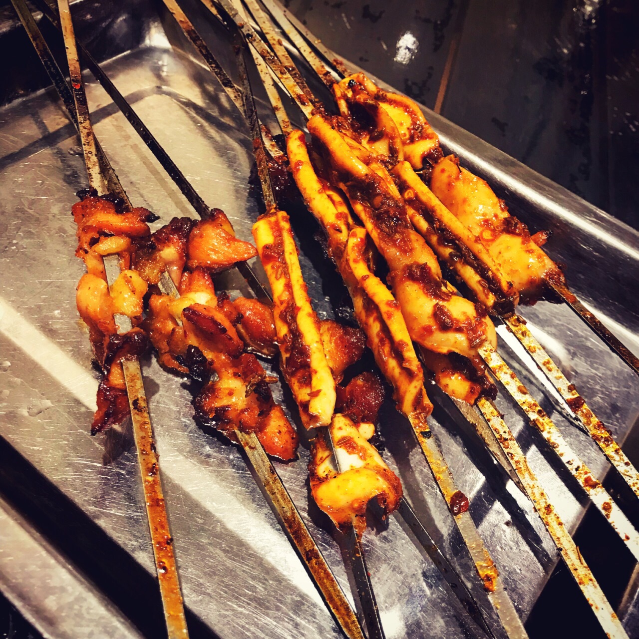 夏季的夜晚怎么能少了烤串加啤酒呢~ 下班后过来人已经是坐满了需要排号,依然人气很火爆,排队期间有提供小吃,顺便还去旁边的星爸爸买了杯冷萃~ 等了有二十多分钟才有座位,环境还可以,就是里面人挺多,闷的很! 点了些硬菜后主要还是吃烤串,服务员会每桌轮流上,看到喜欢的爱吃的就拿点,导致一开始吃的太多,后面上的烤生蚝扇贝都没肚子吃了,有点可惜,哈哈。 总体来说性价比超级超级高,三个人吃到撑也没花到三百,良心商家了!