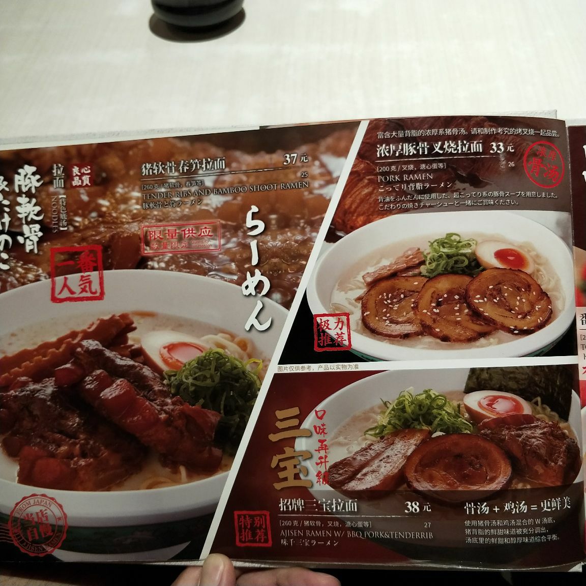 碗里配有有软肋骨,叉烧,糖心鸡蛋,海苔,环境挺好的,干净卫生,空间大,上菜速度快,点单五分钟面就来了
