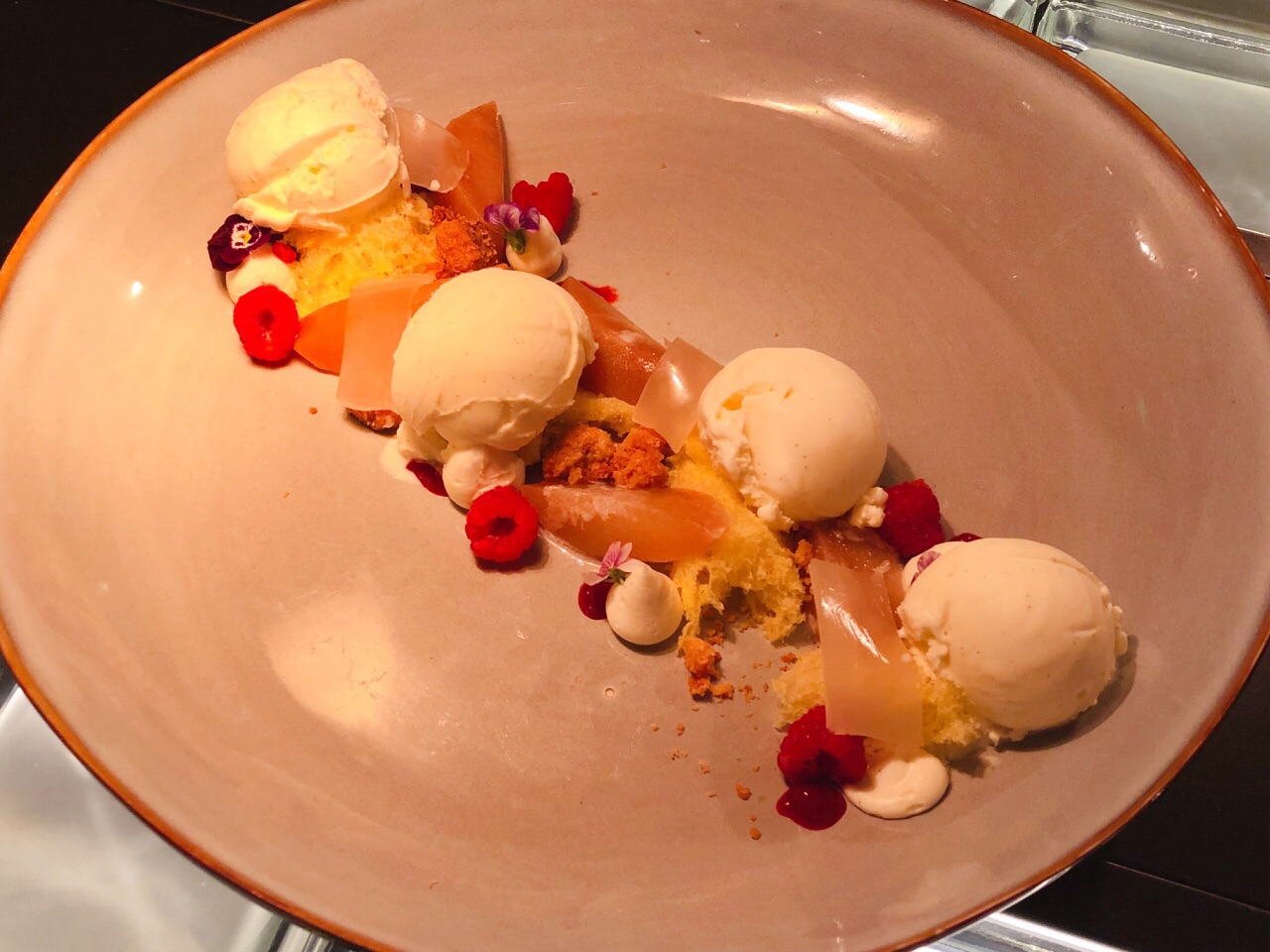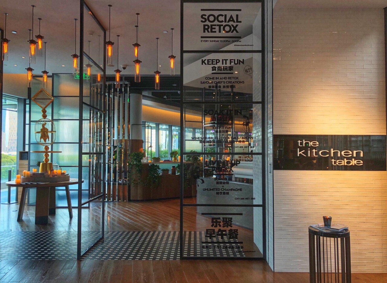今年四月餐厅周探访了楼上的中餐厅 时隔三月 有幸来品味W层的标帜西餐厅 酒店最核心位置 视觉无死角 独揽浦江风貌 餐厅外的泳池和露天餐吧迅速成为网红地标 开阔开放式的用餐环境 有别于其它酒店餐厅的沉闷 菜单和墙面涂鸦的相互辉映 使得餐厅充满了朝气 适合聚餐;又适合劈情操 烛光闪烁 若隐若现 餐前面包 新鲜烤制 热乎着 韧劲十足 配着黄油吃口香而劲道 「西班牙冷切肉盘,腌制甜椒、橄榄及面包脆」有火腿、有香肠片 可以就着面包脆食用 「有机原种番茄、波农尼芝士、萝卜、橄榄油」选用两种剥皮番茄 搭配芝士 是吃口酸酸的开胃菜 「腌渍沙丁鱼、夏巴塔面包、番茄干和欧芹」没吃到沙丁鱼 只吃到番茄干 又是一款酸口的开胃前菜 「黄油慢煮海鲜盘、豌豆和茴香」大块厚切的鲜三文鱼 嫩度有 调味略淡;内附的豌豆很清新 除了这些还有青口贝、八爪鱼及龙虾肉 饱满而鲜美 「烤鸭肉和小洋葱、帕玛森芝士和香料」酱香型 剔骨的鸭肉丝丝顺滑 口味咸鲜 有搭配洋葱和蘑菇哦 「伊比利亚薄切猪里脊、桃子番茄酱、芝麻菜」炸至金黄 面包粉裹得略厚 里脊扎实肉嫩 喜欢蘸桃子番茄酱 酸甜的口感 「松露土豆泥&蘑菇&蔬菜色拉」配角们一一上场 土豆泥厚重细腻 伴有松露香;蘑菇酱汁浓郁;蔬菜爽口 「梅尔巴氏桃子冰激凌、荔枝果冻、树莓酱、脆片」新鲜桃子切片,搭配香草冰激凌 惊讶于透明薄片的荔枝果冻及湿软绵密的蛋糕胚底 香浓甜蜜 树莓酸口 丰富了整个口腔的味蕾 「帕夫洛娃」以俄罗斯体操运动员命名的蛋白饼 带着点空气感的酥脆 有各式水果的点缀 浇灌了百香果酱 使之酸甜平衡;怀疑chef是俄罗斯人 这里的白天和夜晚有着不同的景致 午市精选等着你