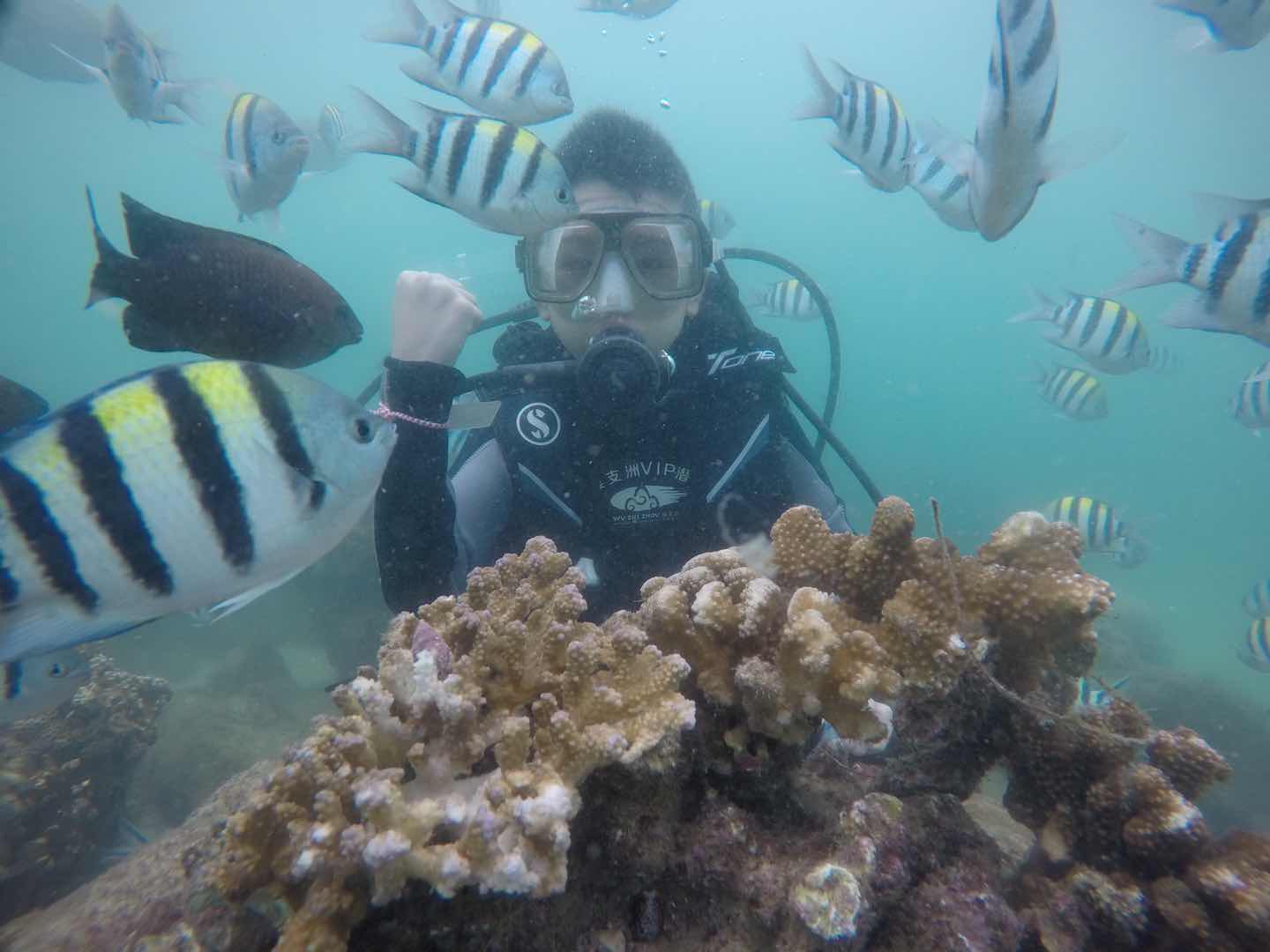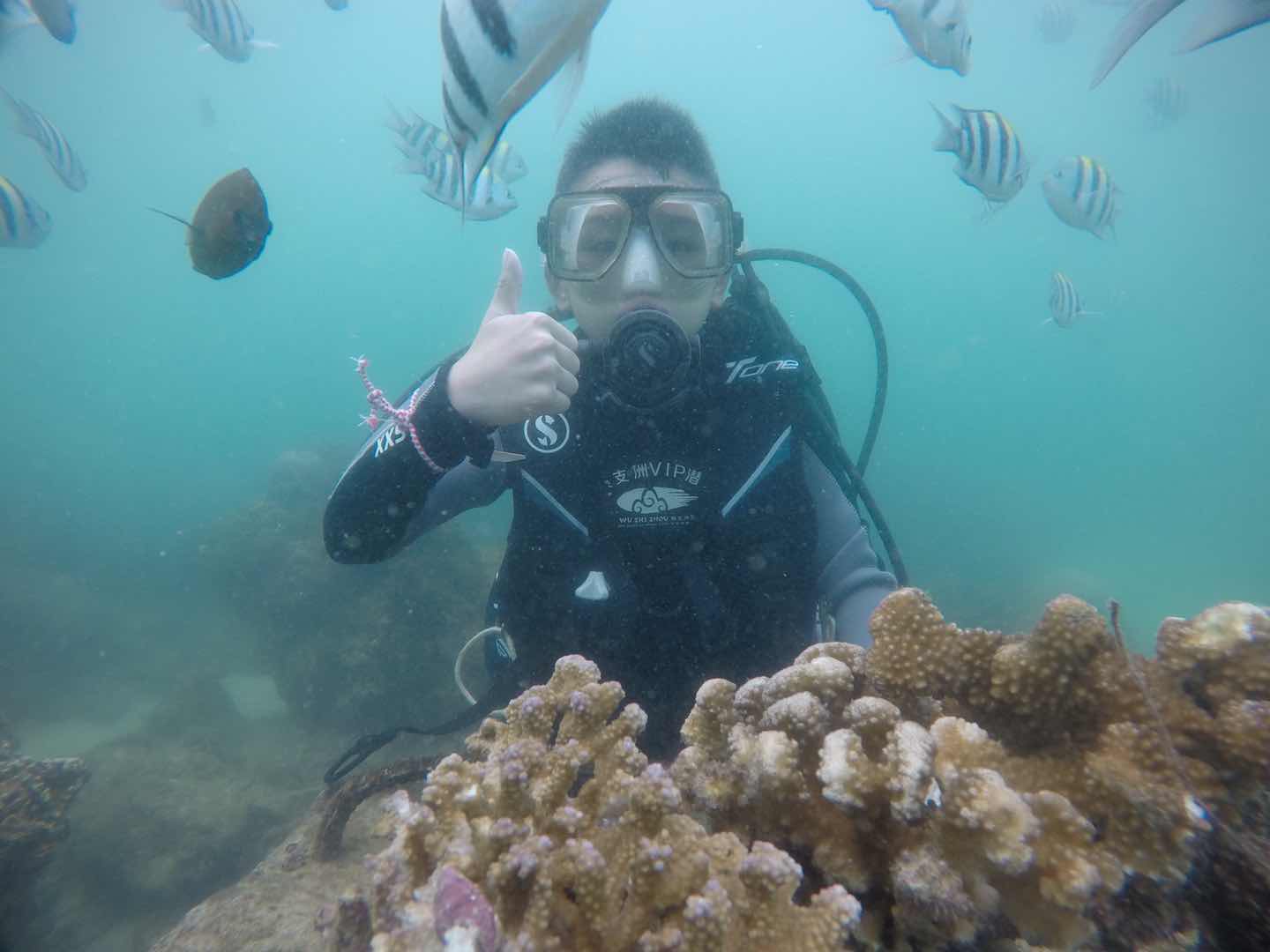 很漂亮的岛屿,我们报了潜水和太空漫步,儿子非常喜欢,就连不会游泳的我都下去尝试了,感觉好开心,教练一对一,真的很负责,潜水还用画板写字告诉我哪个是红珊瑚,哪个是海参,哪些有毒的 不可碰,感觉超开心.太空漫步也是感觉很奇特的感受,一个七十多斤的太空帽戴在头上 底空的 下水居然不进水 哈哈 一路走过去十分钟,每一步下面都有一个教练照看安全。蜈支洲岛本身也很漂亮,玩了项目,发现岛都来不及看完了,岛上还有很多人演绎,发抖音,都是自由演唱的。自助餐有两个酒店,一个118,一个198 给大家也参考下 其他小吃炒饭面条路边都有,价格在50左右。