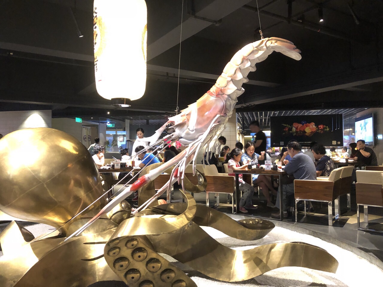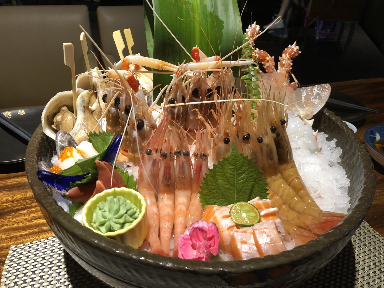 第一次去荣新馆,由于订的时间比较晚,只能预定3号店了,位于金汇路四季广场,紧邻4号店。上去有直达电梯就是入口比较难找,在扶手电梯左手旁边一个小门。 店内环境有点嘈杂,没有预约的都在门口排队。座位呈环形状,由于窗帘拉下靠窗有些昏暗,选择了中间地带的位置。第一轮点了些刺身拼盘,上菜速度很快。接下去第二轮开始就比较慢了。推荐菜:鹅肝、海胆、小青龙、牡丹虾、甜虾
