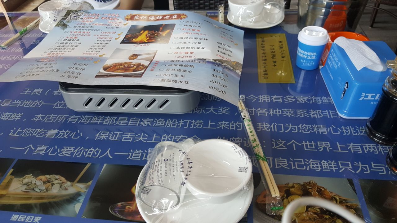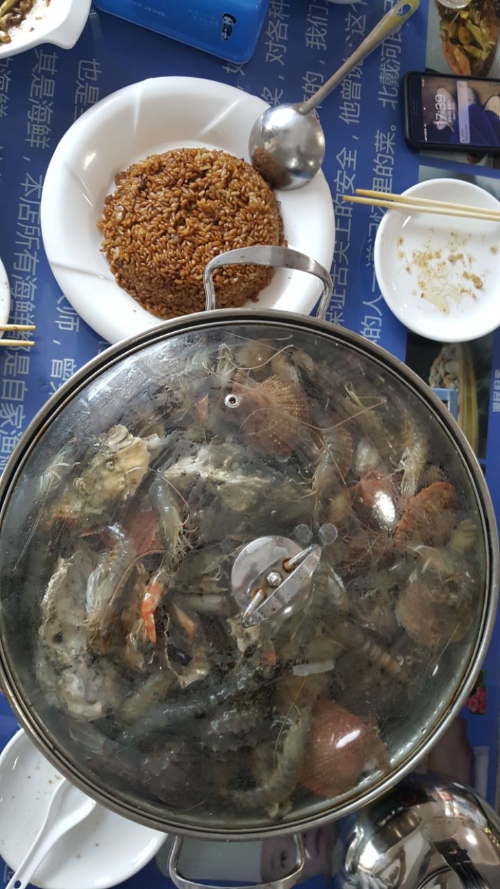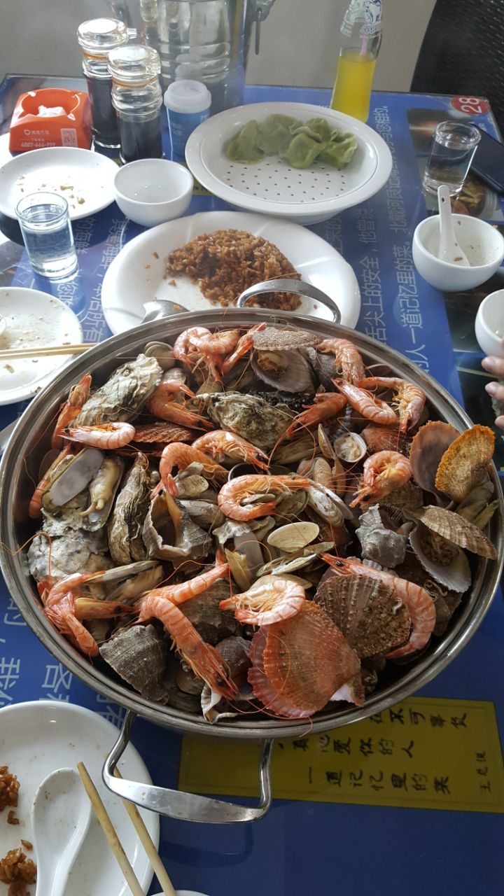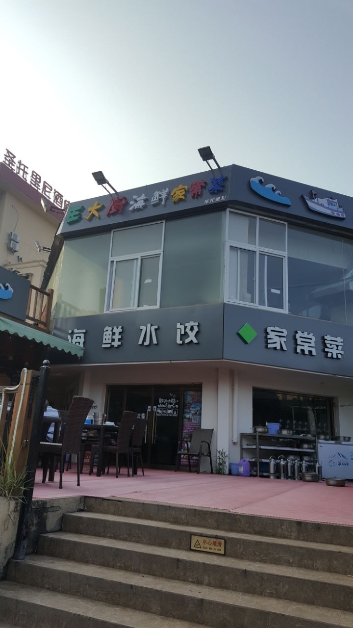 王大厨海鲜家常菜 住在东经路的酒店,看了点评,就来这家试试看。 【位置】东经路69号,与海宁路的交叉路口附近,路的北侧,招牌很醒目,周围饭馆比较多,尤其晚上,人气颇旺。 【环境】外面是海鲜排挡,屋里有空调,很凉爽,也是干净整洁的,环境不错。 【菜品】经推荐买了点评的双人套餐¥198,品种非常丰富,又额外加了一份鲅鱼馅饺子。 【招财进宝】芒果做的,卖相不错,有点儿意思。。 【海鲜一锅】料很足,各种海鲜基围虾、扇贝、海螺、花蛤…食材新鲜,口感不错! 【螃蟹炒菜花】非常入味,很像北京的干锅花菜,也不错。 【鲅鱼饺子】感觉也还可以。 几个前台的服务员,服务特别热情周到,频频换碟,上菜也很快,非常好。 一次非常愉快的就餐,留下美好记忆。标注一下,以备再来光顾。[得意]