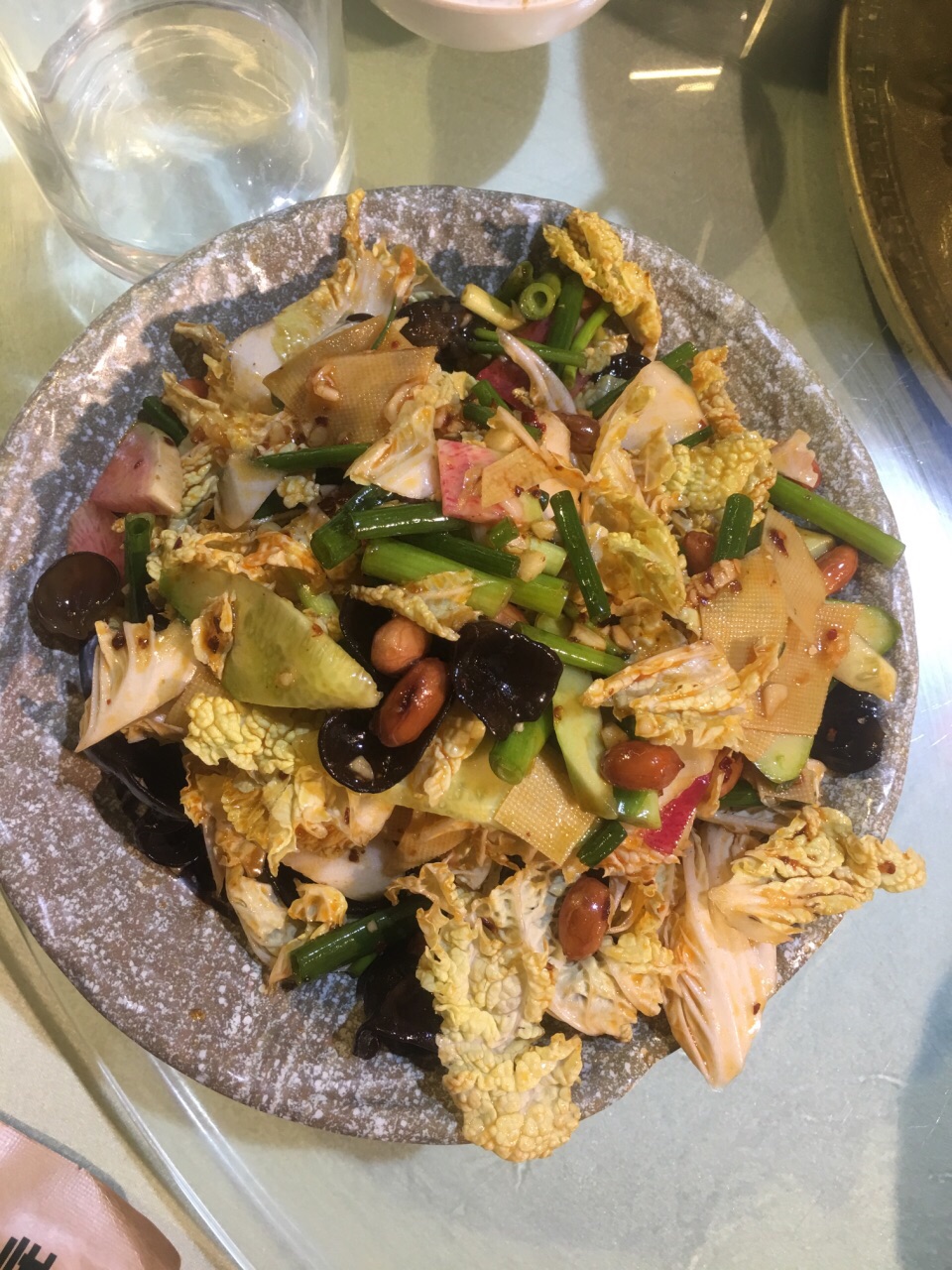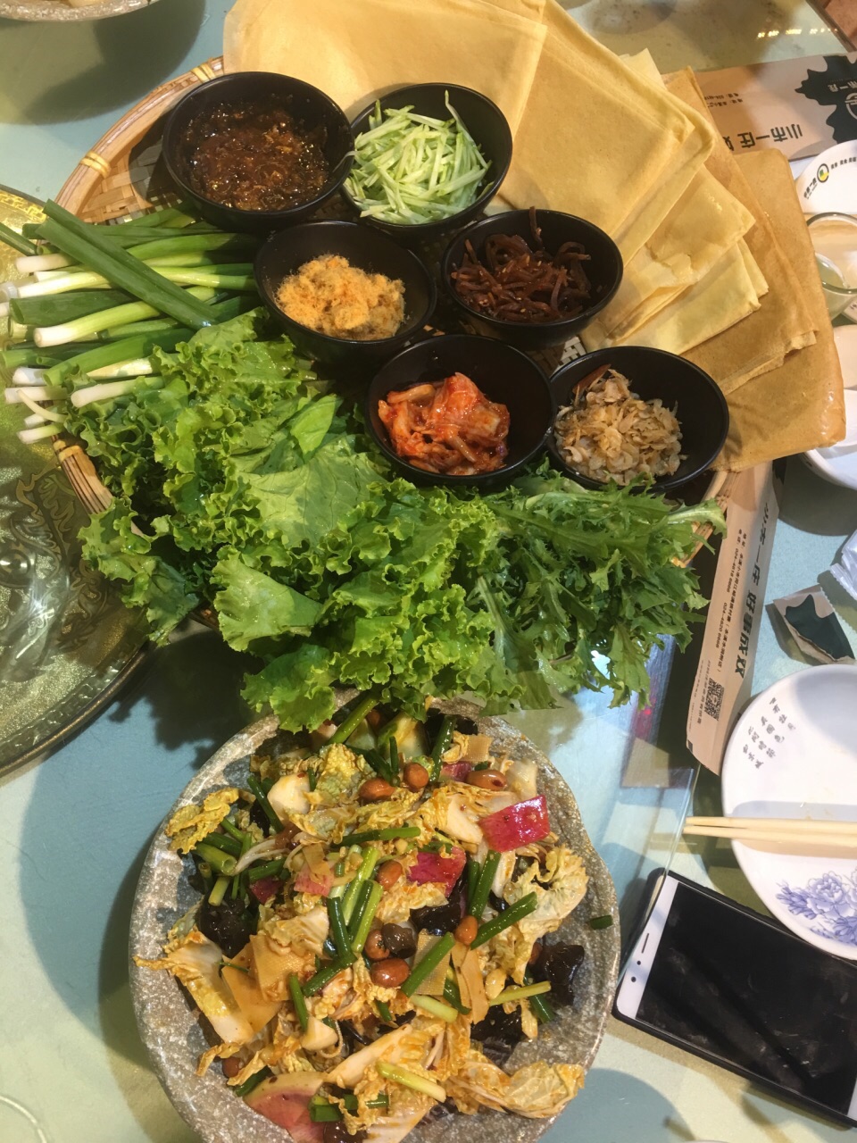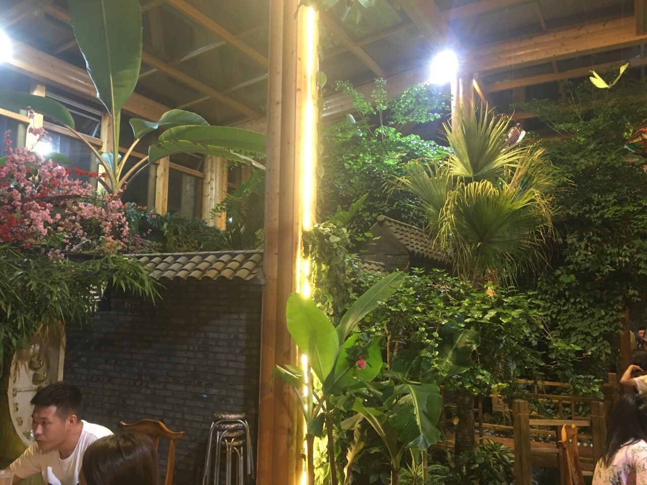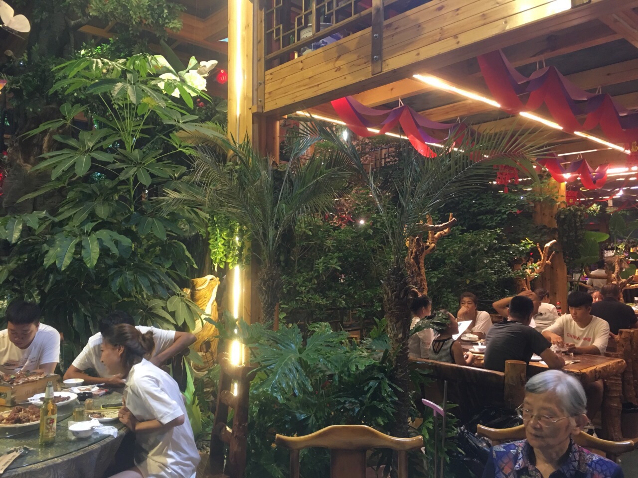 小市一庄离本溪水洞不远,这里其实就是餐饮加 住宿,修得亭台楼阁,又整了许多仙气,照相很 有意境,许多树屋建于人造大树之上,还有其它 房型,只是价格不菲。我们在一片热带雨林中用 餐,价格小贵,吃得还行。羊汤是本溪的主打, 只是里面加了许多血豆腐,要知道回民是不吃血 的。羊肉很新鲜,串的味道也不错。煎饼可以夹 许多小菜,满满一笸箩,太值了。烤茄子是网友 们推荐的,也点了,果然味道好极了。土豆炖 鸡,那个鸡オ半只就一大锅,东北菜果然是量大 十足。