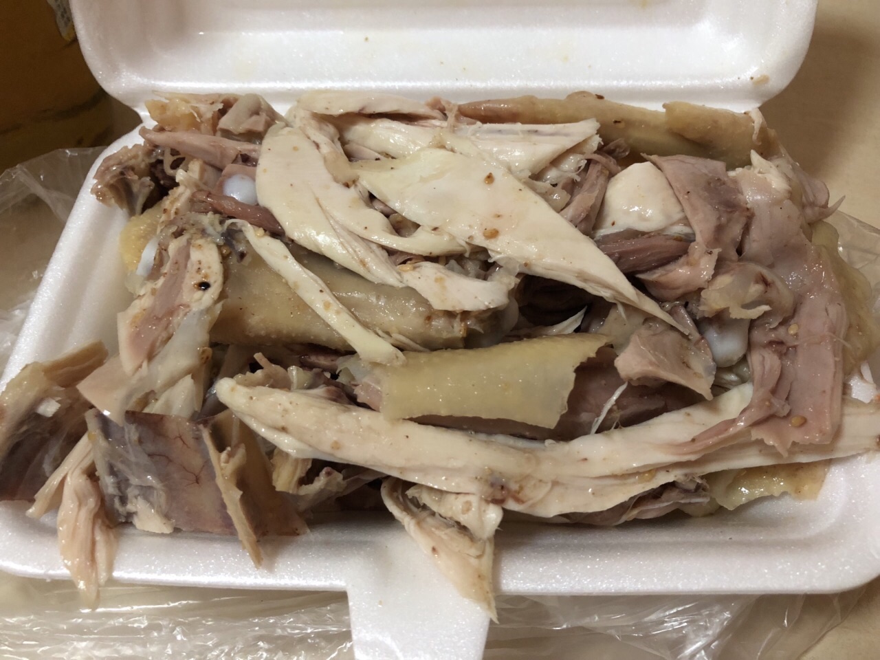 一直看这家烧腊店生意很好,都是周边街坊来买,盐焗手撕鸡看起来不错,鸡有分价格的,要了贵的那个,...一直看这家烧腊店生意很好,都是周边街坊来买,盐焗手撕鸡看起来不错,鸡有分价格的,要了贵的那个,半只鸡满满一盒,肉质相当劲道,很鲜,很下酒!